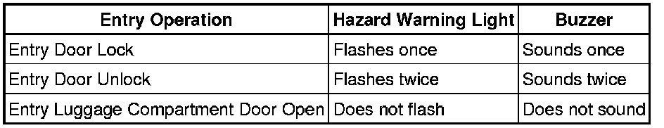 (1) Place the key in the luggage compartment with all doors locked. Check that: 1) closing the luggage compartment door triggers the key's wireless buzzer (which lasts approximately 2 seconds), and 2) pressing the power luggage door open switch opens the luggage compartment door.