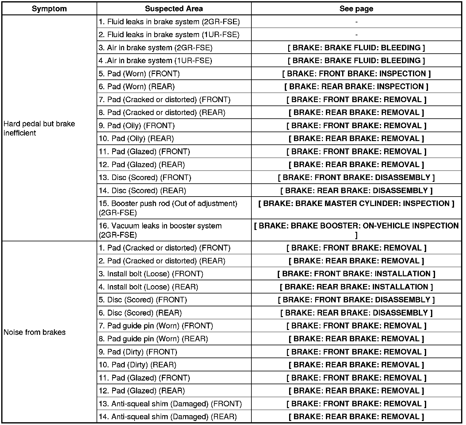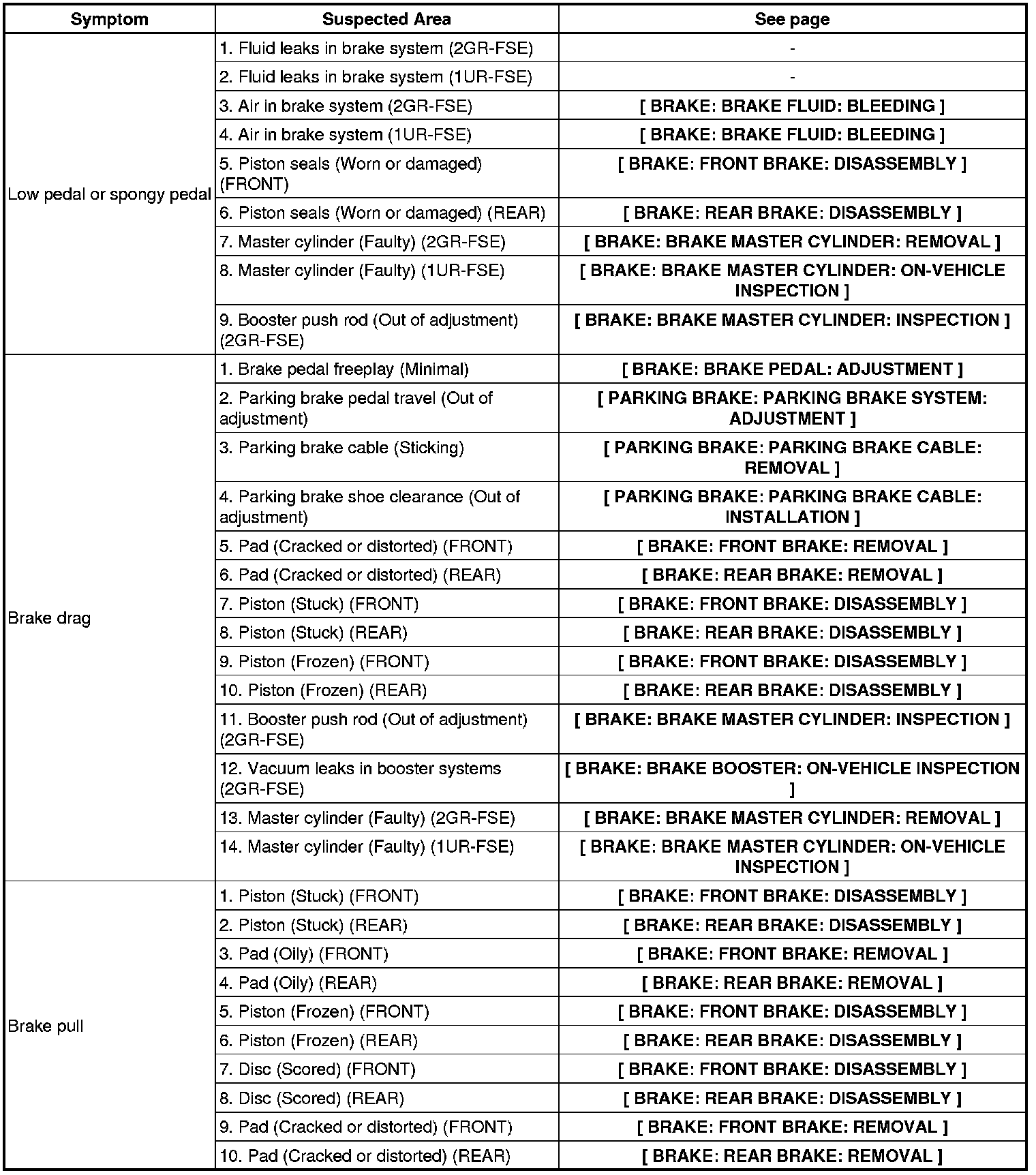 BRAKE: BRAKE SYSTEM: PROBLEM SYMPTOMS TABLE