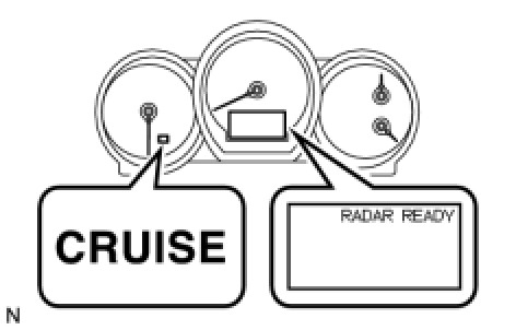 (b) Check that the CRUISE main indicator light and RADAR READY indicator come on when the main switch ON-OFF button is pushed on, and that the indicator light goes off when the ON-OFF button is pushed off.