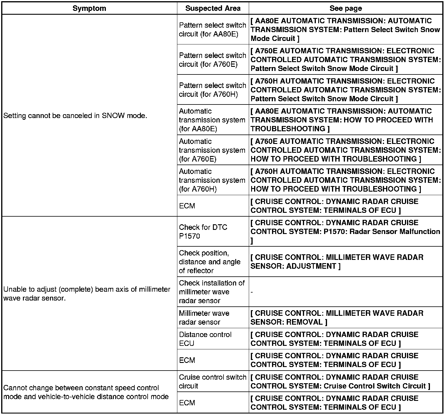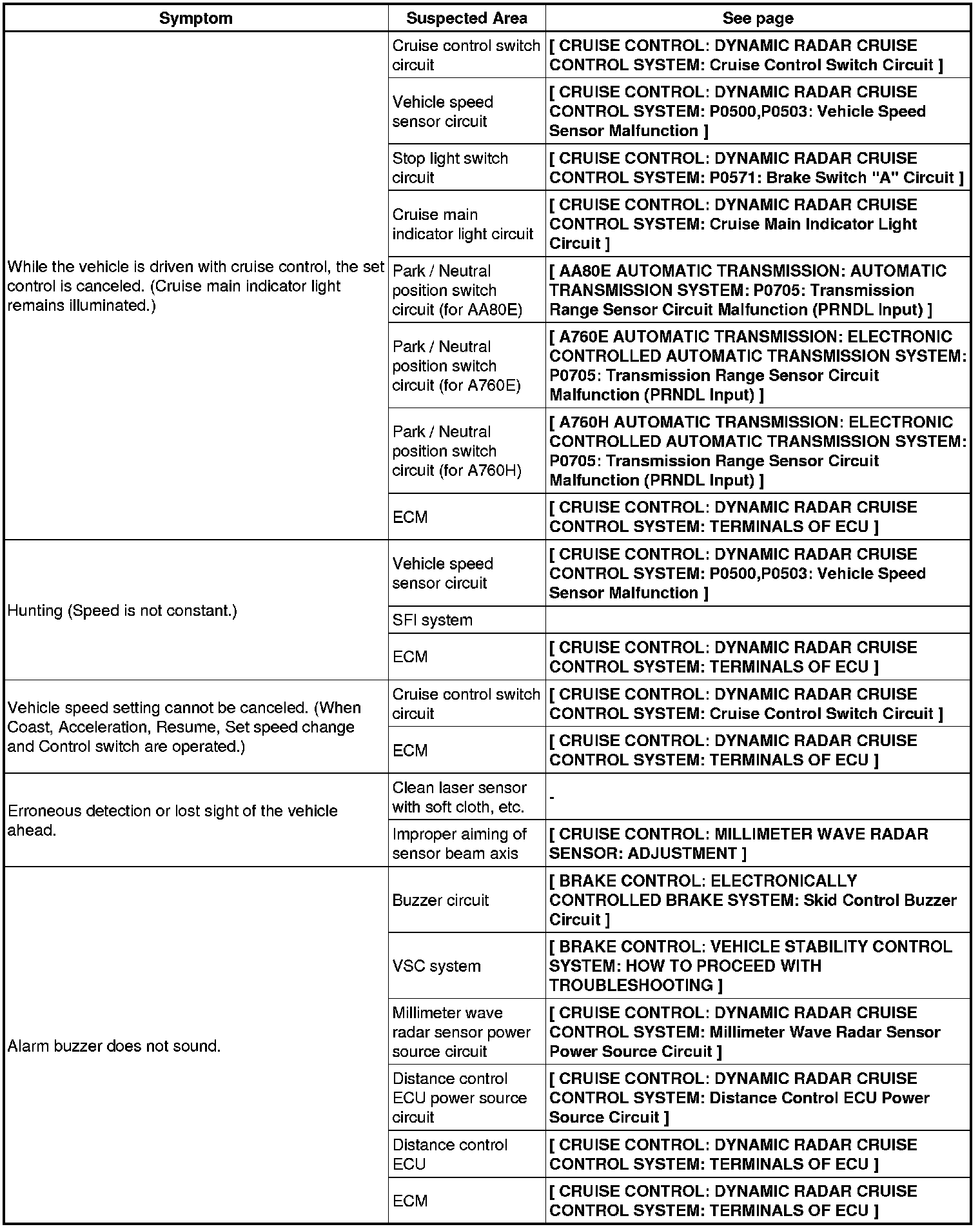 CRUISE CONTROL: DYNAMIC RADAR CRUISE CONTROL SYSTEM: PROBLEM SYMPTOMS TABLE