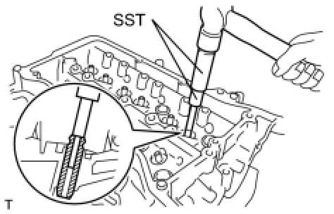 (b) Using SST, install the union to the cylinder head as shown in the illustration.