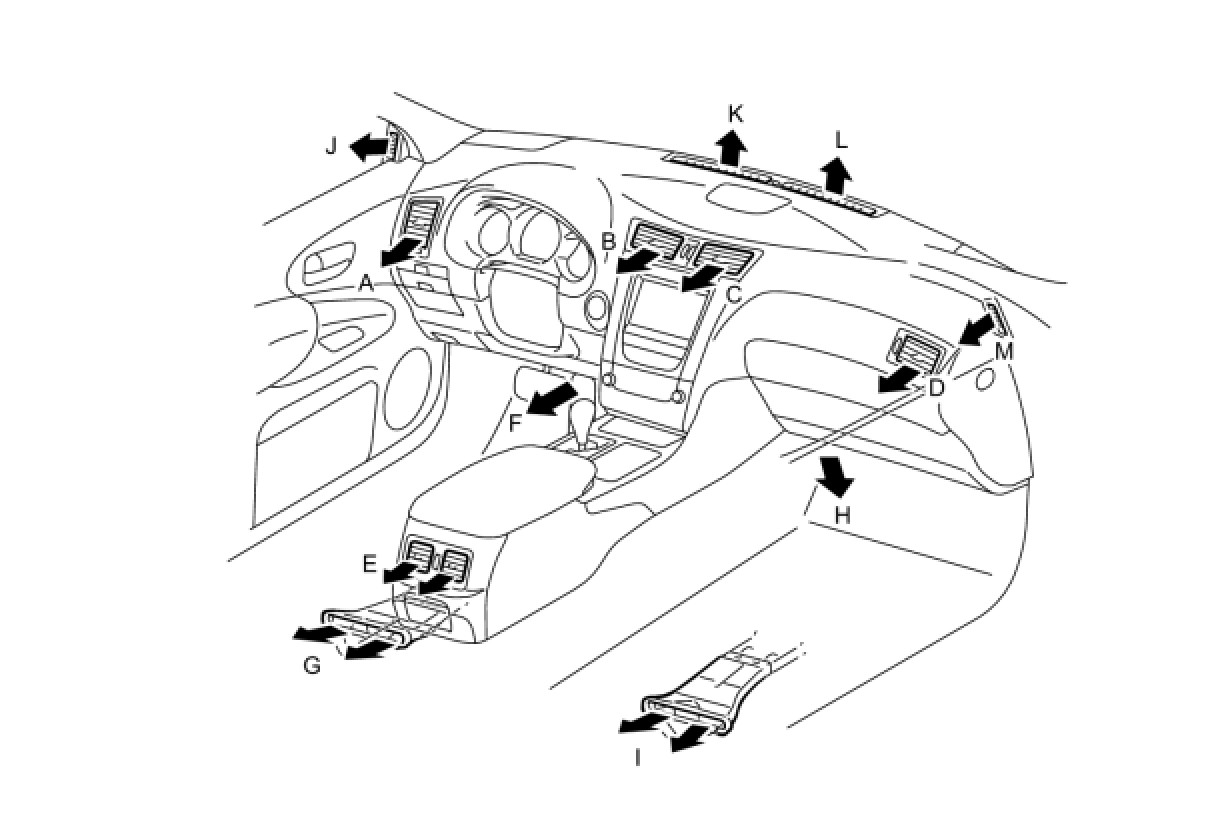* Automatically changes the outlets in accordance with the outlet mode ratio that has been calculated by the A/C amplifier based on the input signals from various sensors.