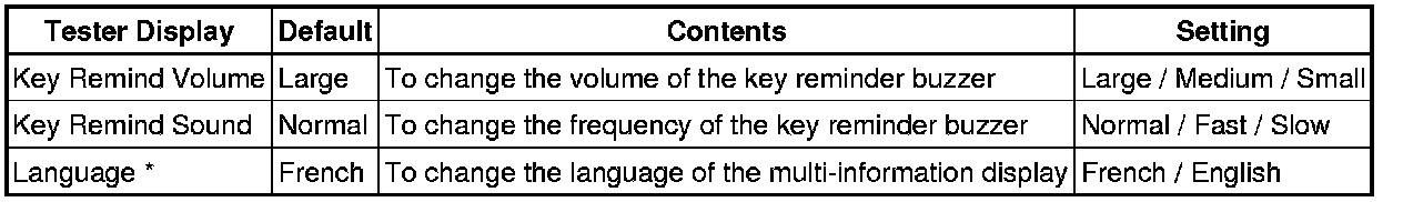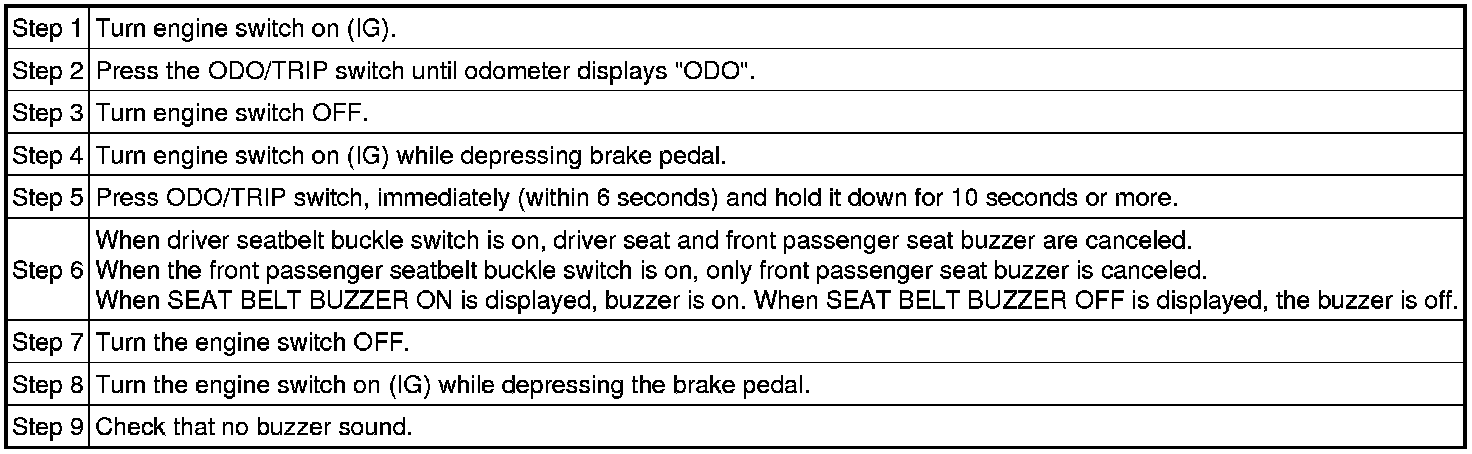 (a) The combination meter's buzzer operation can be customized. There is an ON and OFF setting, which sets or disables the driver's and / or front passenger's seat belt buzzer.