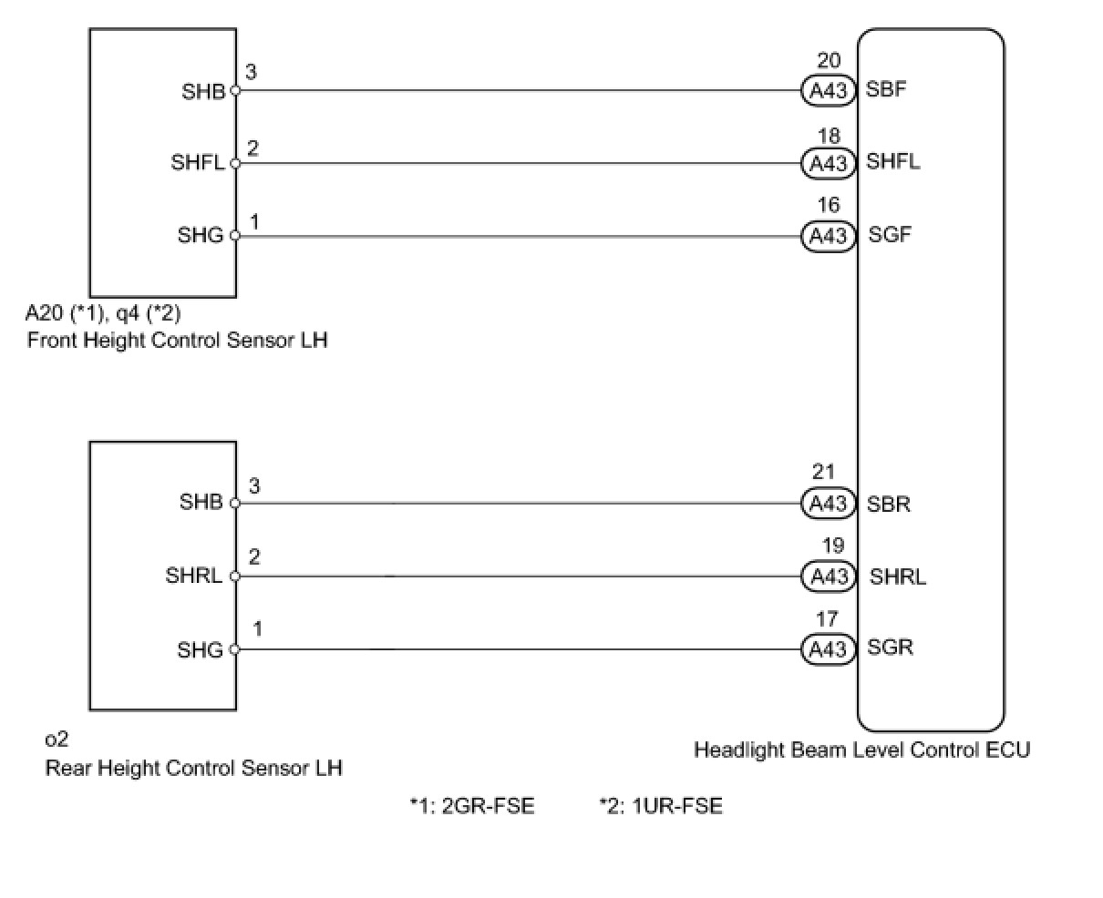 This circuit provides power to operate the height control sensor. The headlight beam level control ECU calculates a height value from the height control sensor signal and the voltage at the power source of the height control sensor. The voltage at the power source of the height control sensor is corrected when SHFL or SHRL is detected.