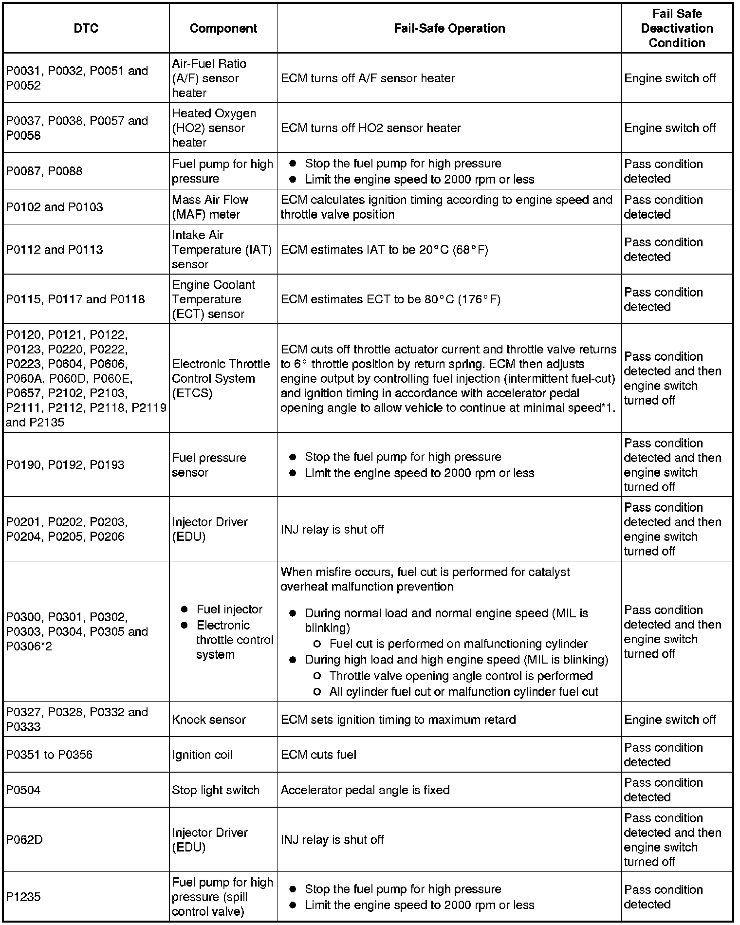 If any of the following DTCs are set, the ECM enters fail-safe mode to allow the vehicle to be driven temporarily.