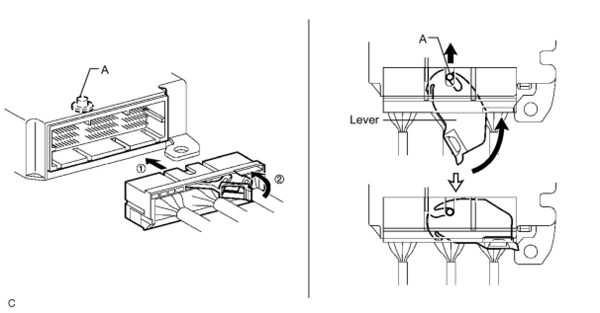 (a) Pull the lever by pushing part A as shown in the illustration and disconnect the holder (with connectors).