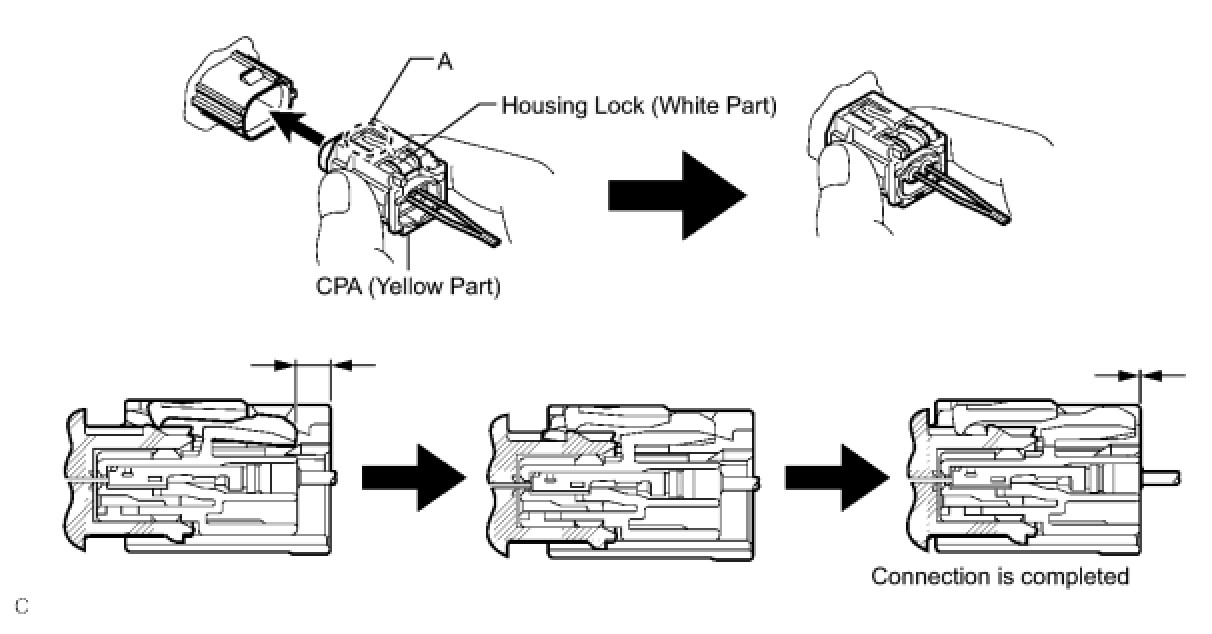 (a) Push down the housing lock (white part) and slide the CPA (yellow part). (At this time, the connector cannot be disconnected yet.)