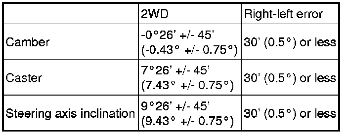 * The maximum tolerance of right and left difference for the camber and caster is 30' (0.5°) or less.