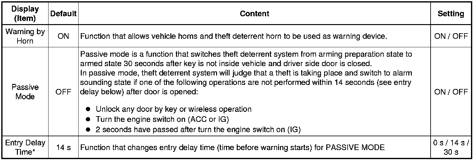 * *2: This function is linked with the power window wireless transmitter-linked function. If the power window wireless transmitter-linked function is set to OFF, the sliding roof wireless transmitter-linked function will not operate even when it is set to ON.