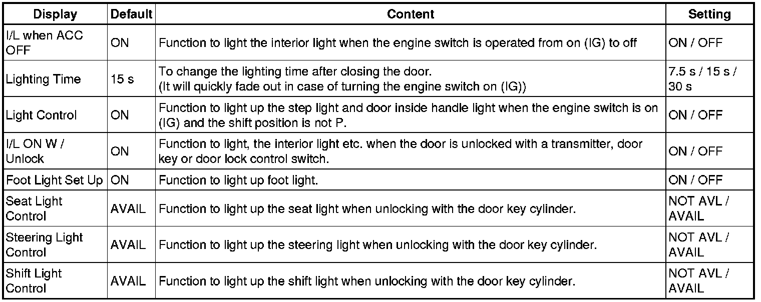 * Mode 4: When map light assembly ON switch is pressed, front personal lights, rear personal lights, front seat lights and rear seat lights illuminate