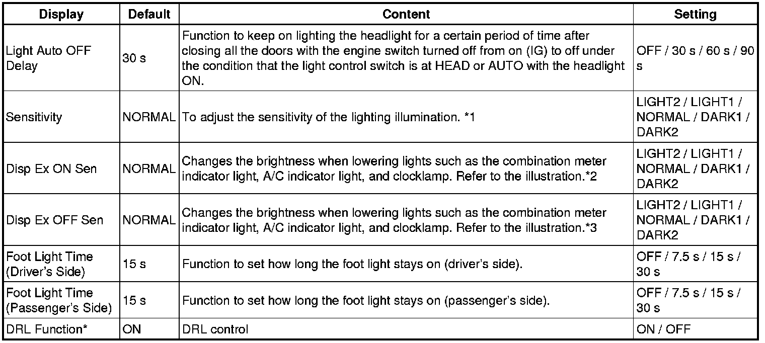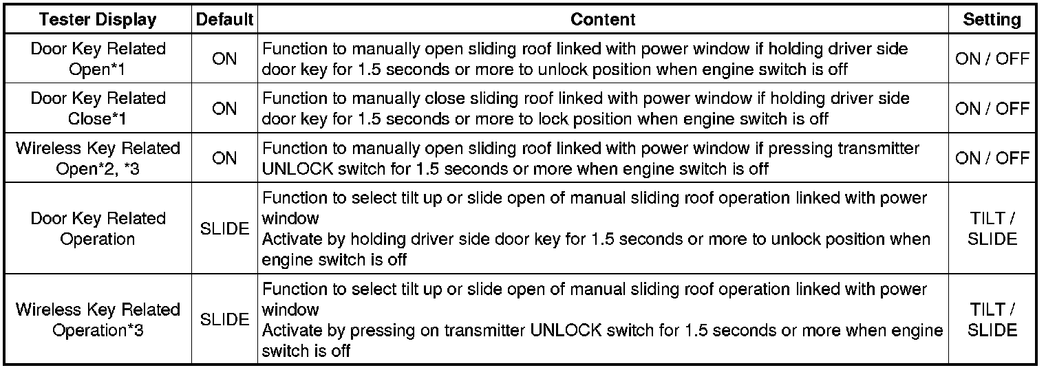 * *1: This function is linked with the power window key-linked function. If the power window key-linked function is set to OFF, the sliding roof key-linked function will not operate even when it is set to ON.