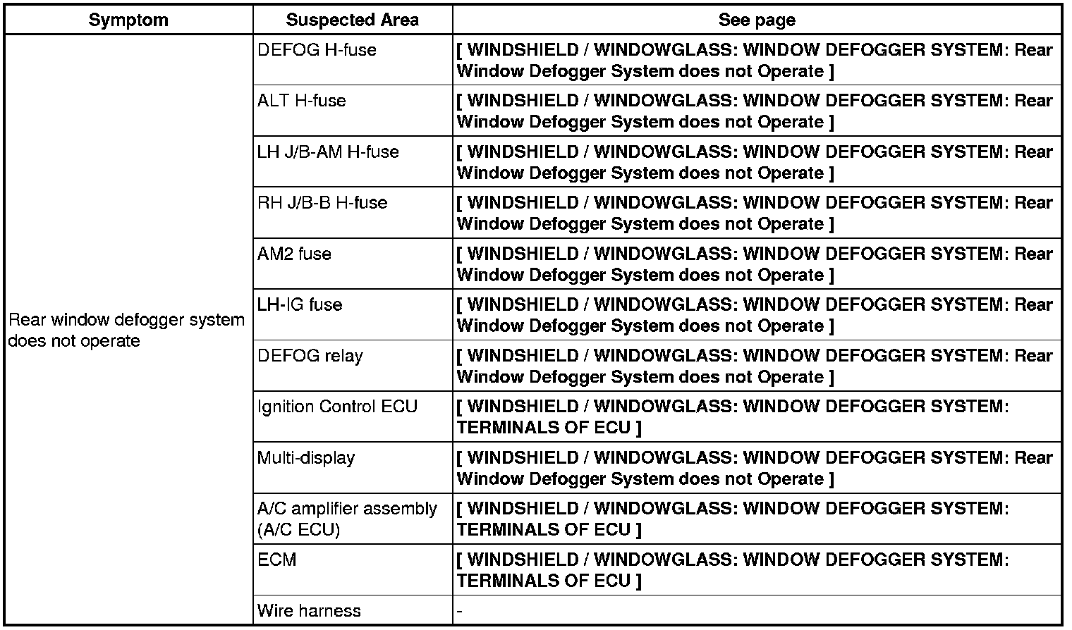 WINDSHIELD / WINDOW GLASS: WINDOW DEFOGGER SYSTEM: PROBLEM SYMPTOMS TABLE