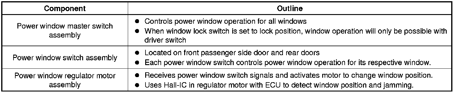 * The power window control system controls the power window UP/DOWN function using the power window regulator motors. The main controls of this system are the master switch which is built into the driver side door, and the power window switches which are built into the front passenger side door and rear doors.