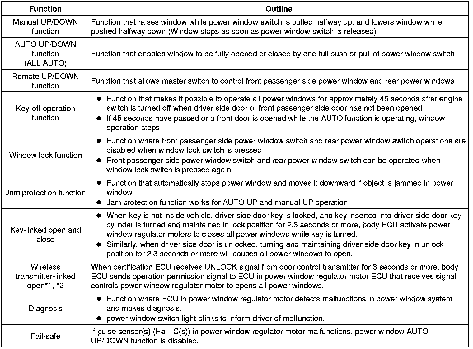 * Pressing either of the power window switches on the power window switches or either of the power window switches on the master switch transmits an UP/DOWN signal to the corresponding power window regulator motor assembly.