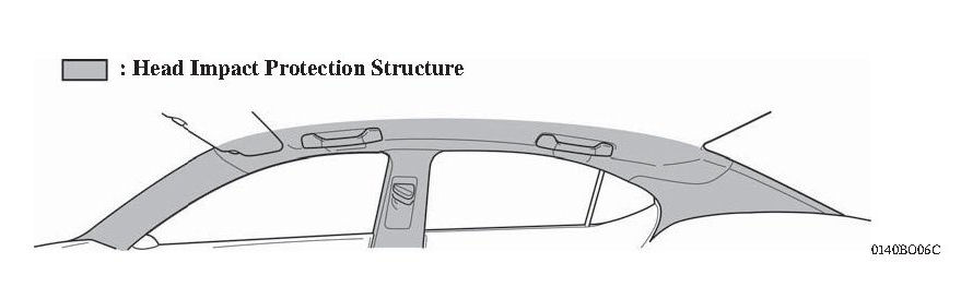 ^ A Head Impact Protection Structure is used. With this type of construction, if the occupant's head hits against the roof side rail and pillar in reaction to a collision, the inner panel of the roof side rail and pillar collapses to help reduce the impact.