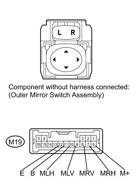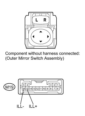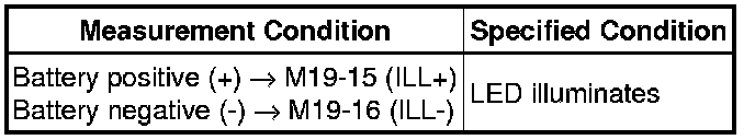 (1) Apply battery voltage to the outer mirror switch assembly and check that the LED illuminates.