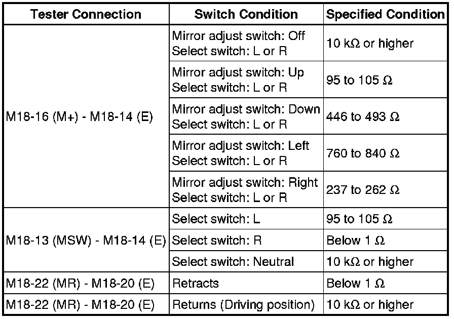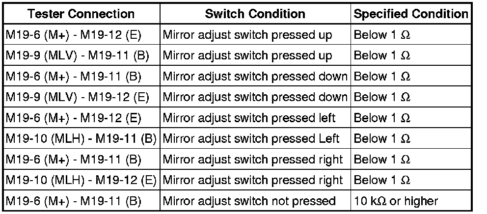 (2) If the result is not as specified, replace the outer mirror switch assembly.