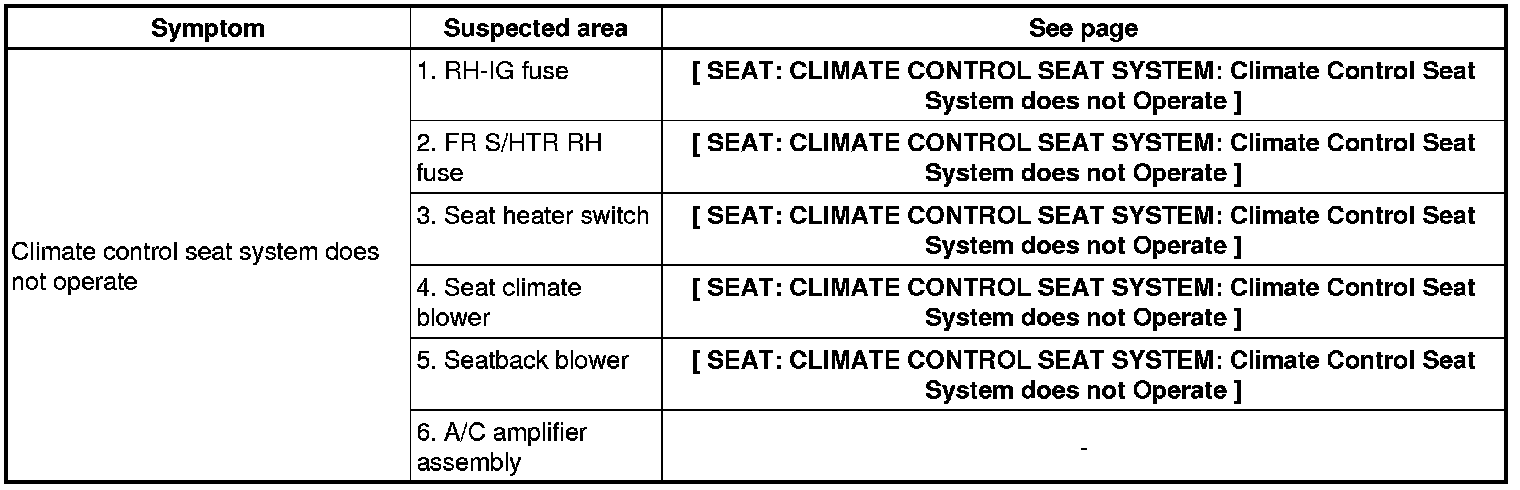 SEAT: CLIMATE CONTROL SEAT SYSTEM: PROBLEM SYMPTOMS TABLE