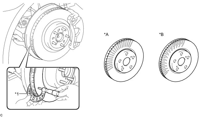 (c) If the runout exceeds the maximum value, change the installation positions of the disc and axle so that the runout will become minimal. If the runout exceeds the maximum even when the installation positions are changed, check the bearing play in the axial direction and the axle hub runout Front Axle Hub. If the bearing play and the axle hub runout are normal and if the disc thickness is not within the specified range, grind the disc. If the disc thickness is less than the minimum, replace the disc.