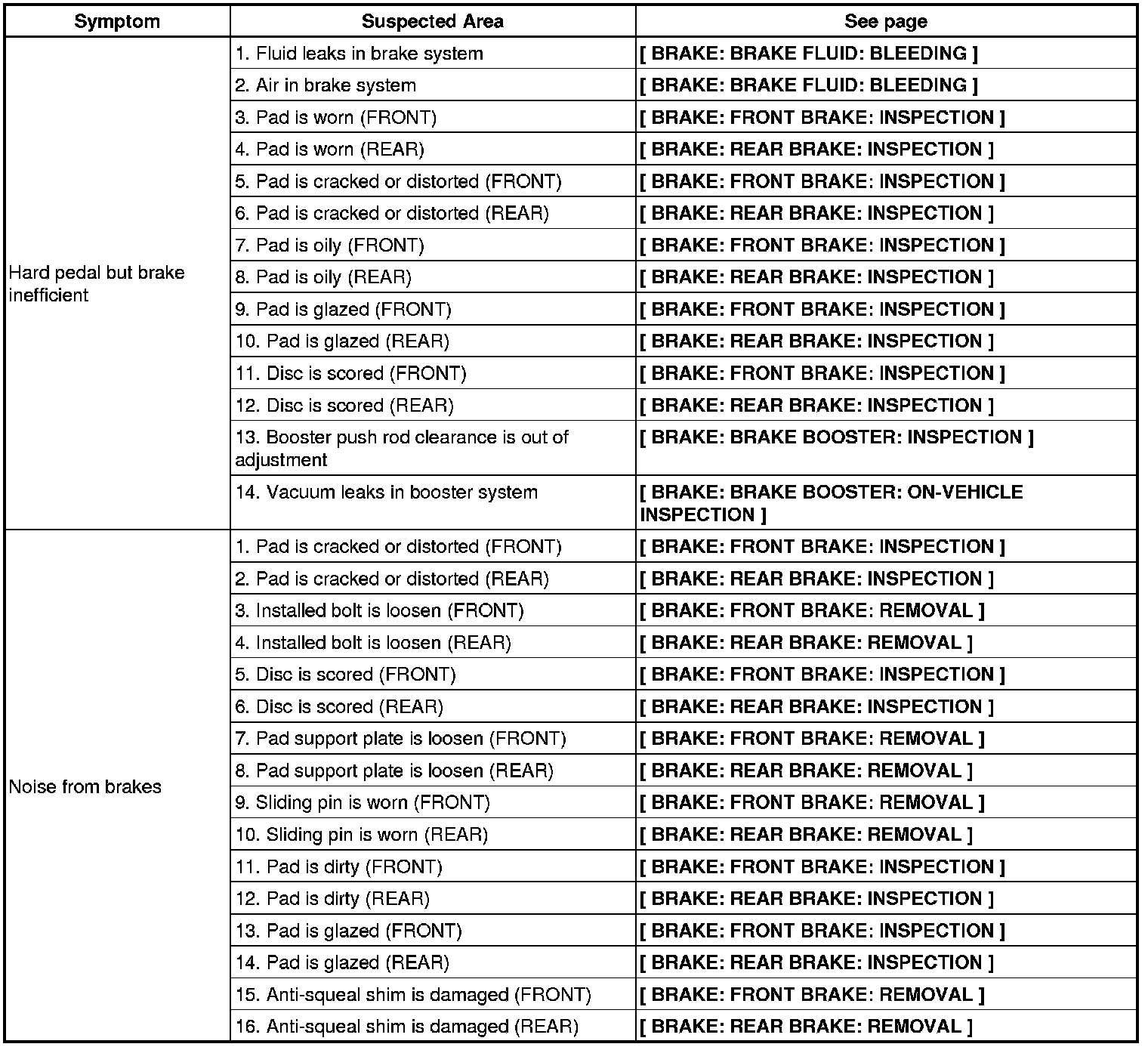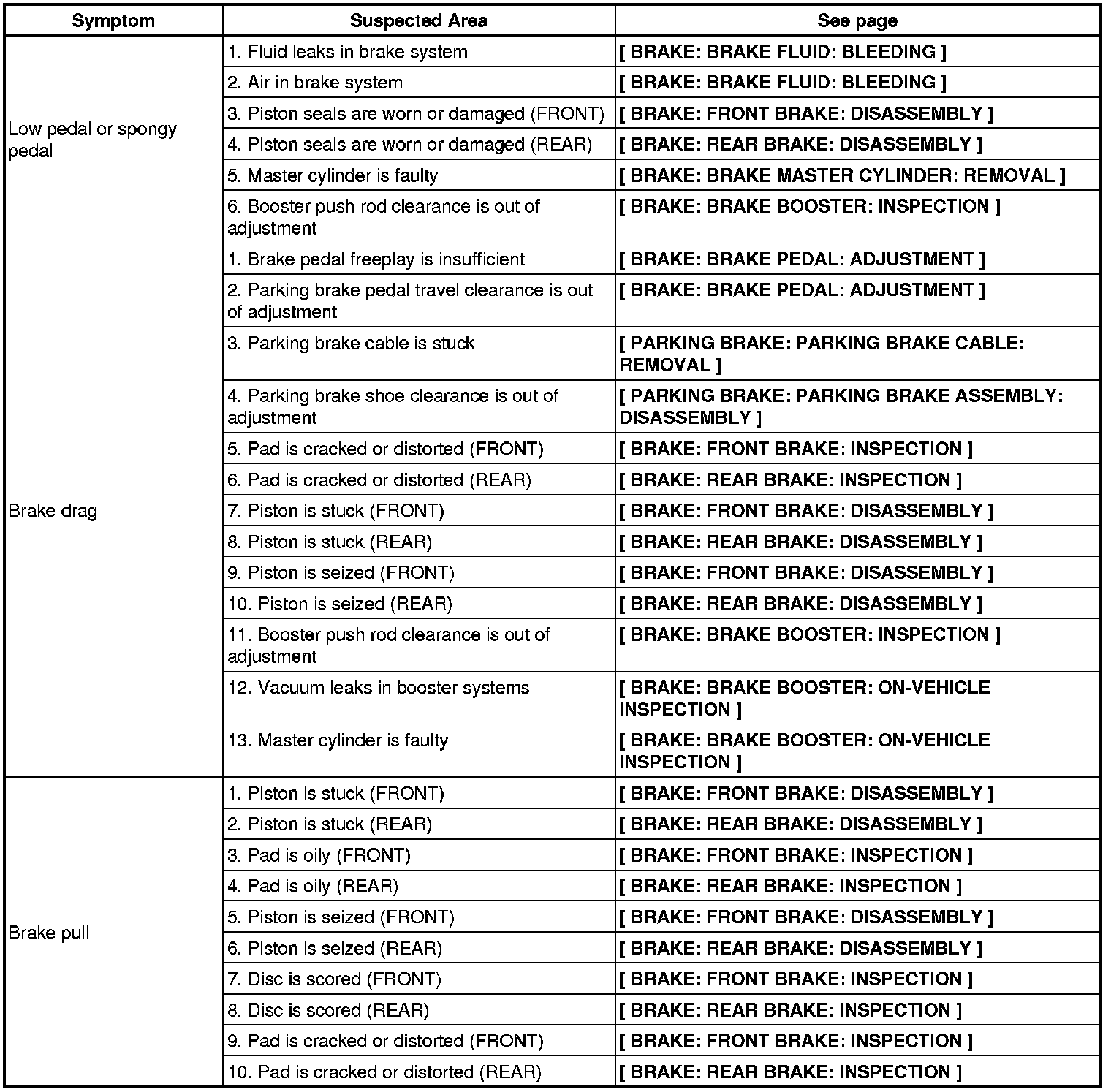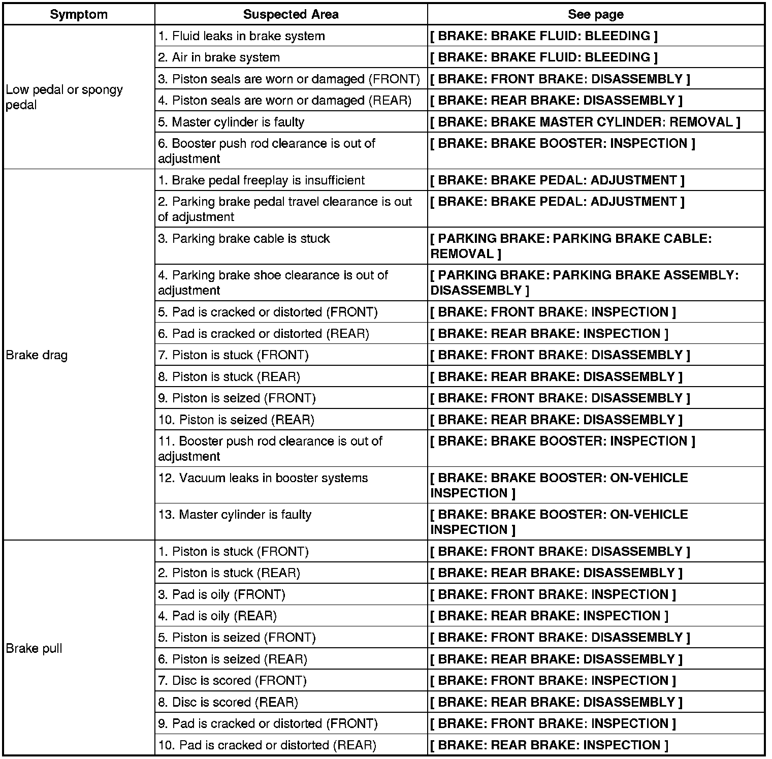 BRAKE: BRAKE SYSTEM: PROBLEM SYMPTOMS TABLE