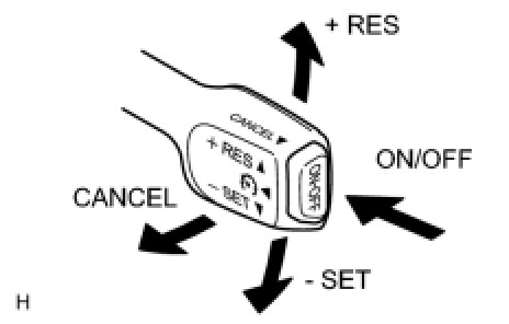 The cruise control main switch operates 7 functions: SET, - (COAST), TAP-DOWN, RES (RESUME), + (ACCEL), TAP-UP, and CANCEL. The SET, TAP-DOWN, and - (COAST) functions, and the RES (RESUME), TAP-UP, and + (ACCEL) functions are operated with the same switch. The cruise control main switch is an automatic return type switch which turns on only while operating it in the direction of each arrow and turns off after releasing it. The internal contact point of the cruise control main switch is turned on with the switch operation. Then the ECM reads the voltage value that has been changed by the switch operation to control SET, - (COAST), RES (RESUME), + (ACCEL), and CANCEL.