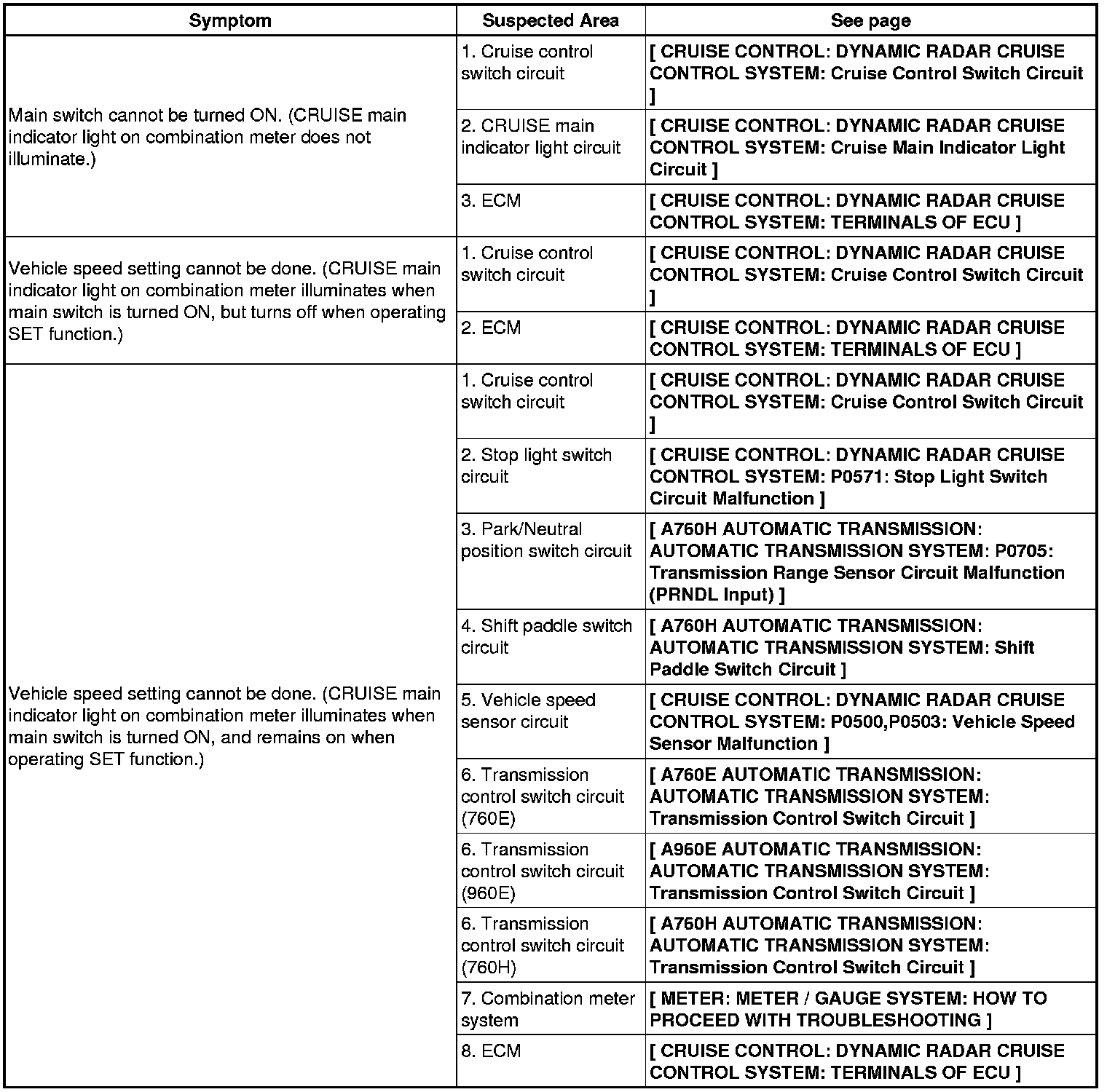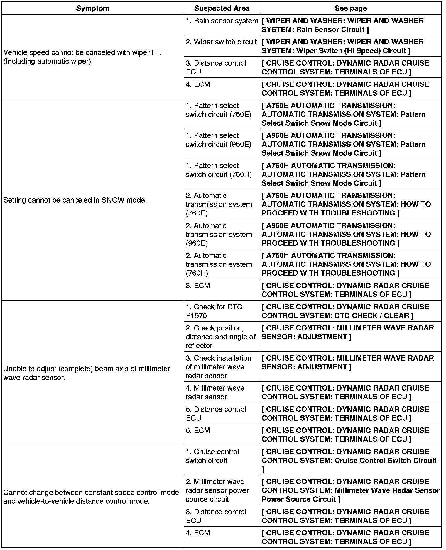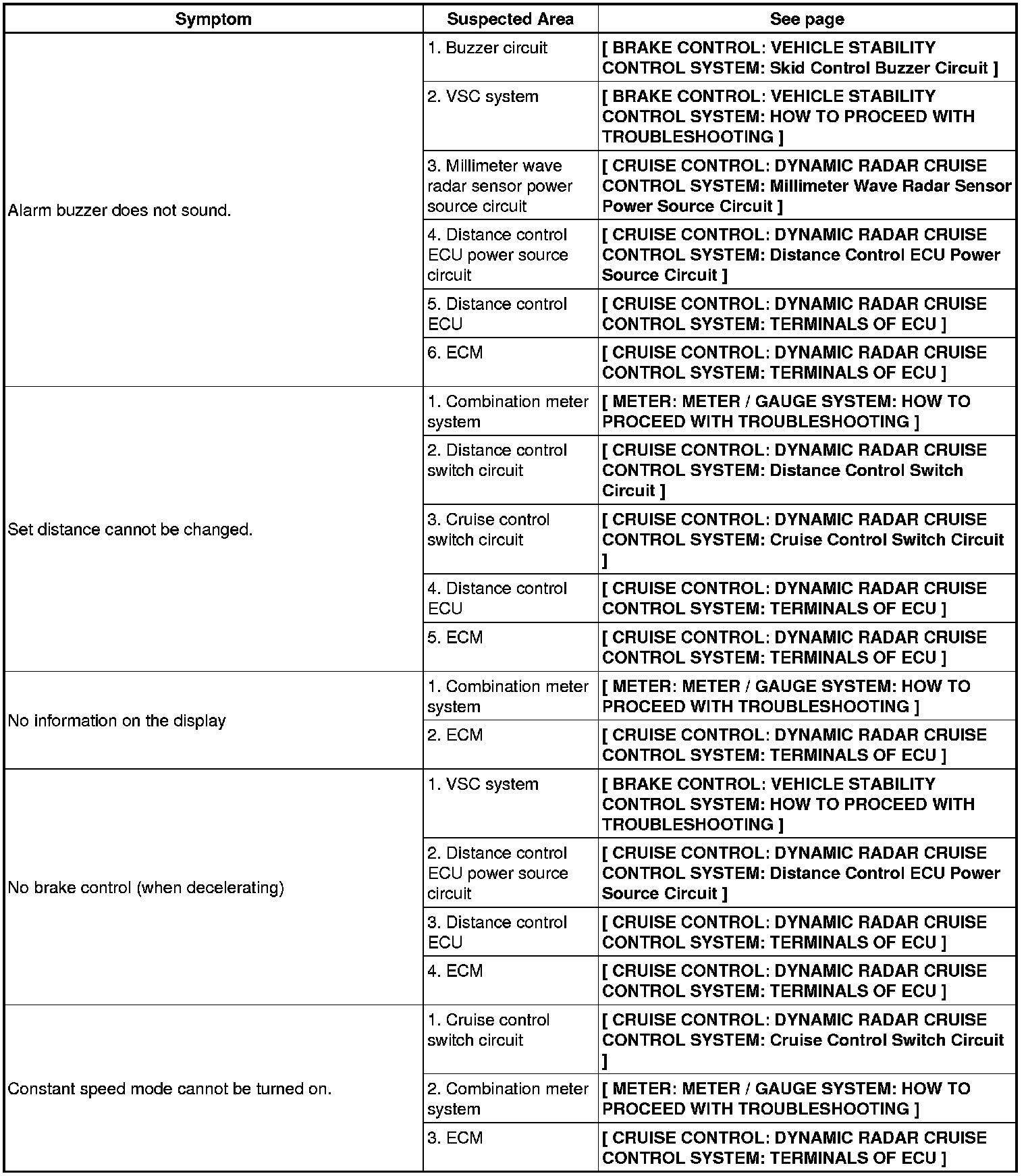 CRUISE CONTROL: DYNAMIC RADAR CRUISE CONTROL SYSTEM: PROBLEM SYMPTOMS TABLE