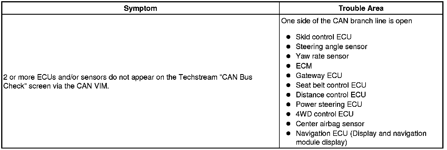 If some ECUs and sensors repeatedly appear and disappear from the "CAN Bus Check" screen, communication between the normal ECUs (sensors) and Techstream may be affected by the incomplete signals that are output from the ECU that has an open circuit in either of its CAN branch lines. In this case, the CAN branch lines for the ECUs and sensors that repeatedly appear and disappear from the screen are normal and the ECU that is not displayed on the screen may be the main cause of the problem (this ECU may have an open circuit in either of its CAN branch lines).