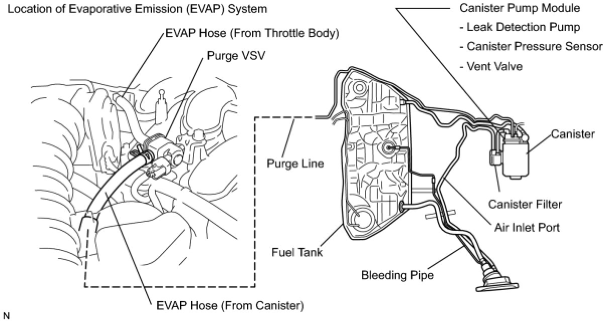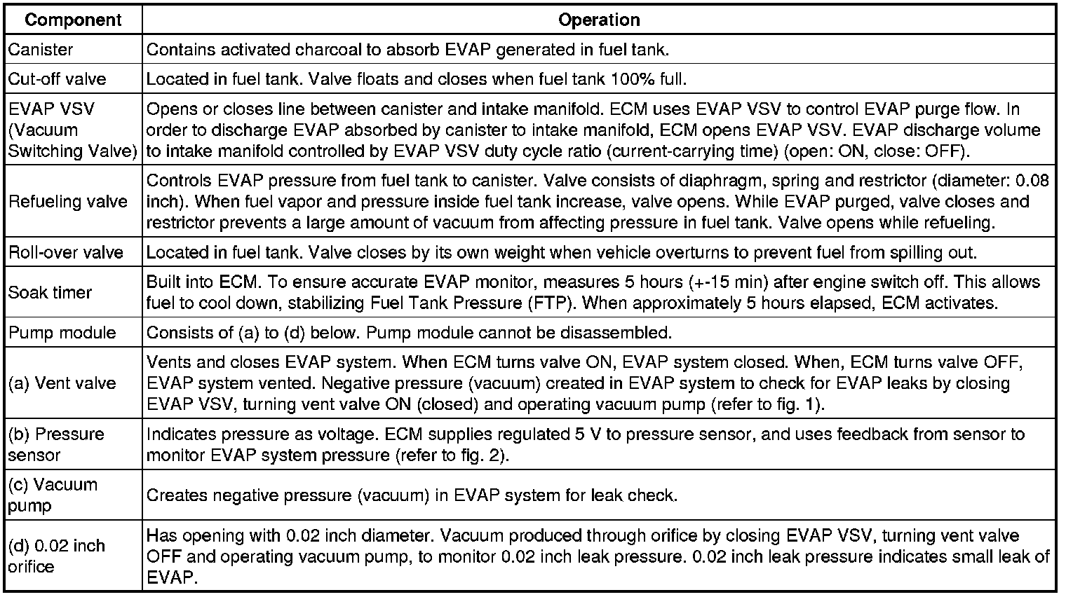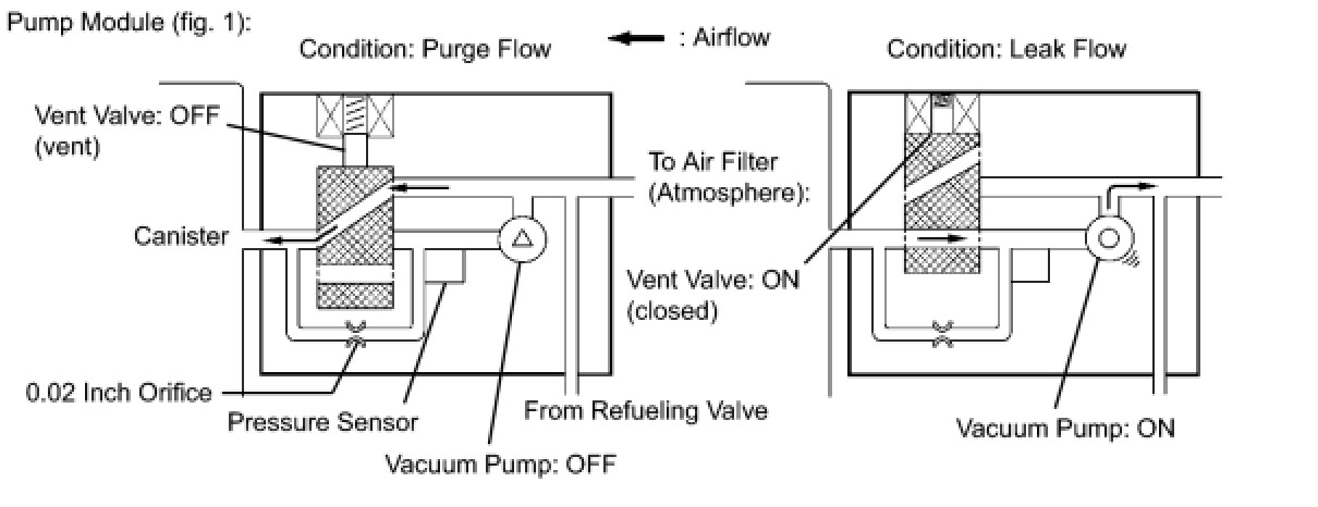 The electric vacuum pump creates negative pressure (vacuum) in the EVAP system and the pressure is measured. Finally, the ECM monitors for leaks from the EVAP system and malfunctions in both the pump module and EVAP VSV, based on the EVAP pressure.