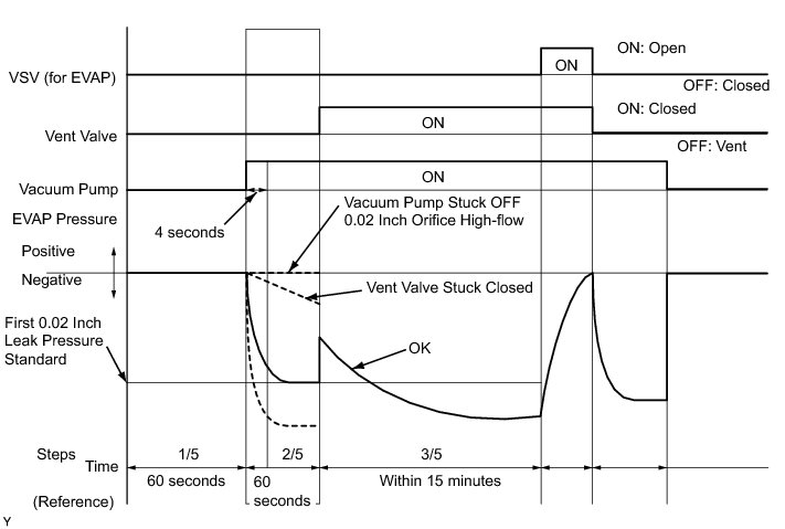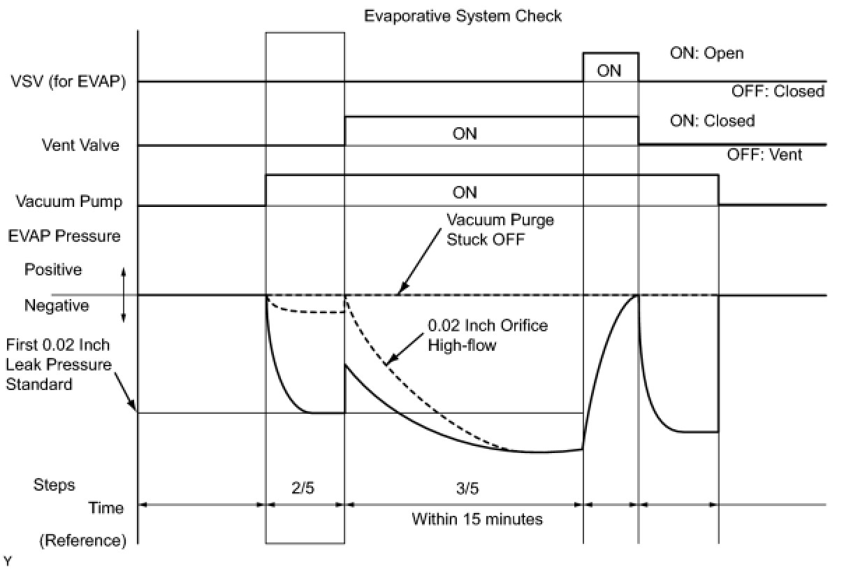 * The vent valve turned OFF (open) and the EVAP pressure is then measured. If the variation in the pressure is less than 0.5 kPa (3.75 mmHg), the ECM interprets this as the EVAP VSV being stuck closed, and illuminates the MIL and sets DTC P0441 (2 trip detection logic).