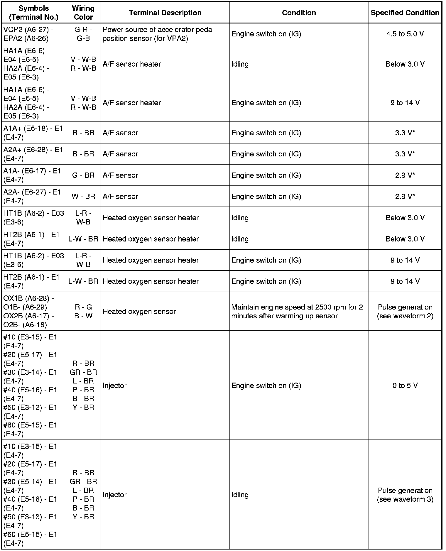 The standard normal voltage between each pair of the ECM terminals is shown in the table below. The appropriate conditions for checking each pair of the terminals are also indicated. The result of checks should be compared with the standard normal voltage for that pair of terminals, displayed in the Specified Condition column. The illustration above can be used as a reference to identify the ECM terminal locations.