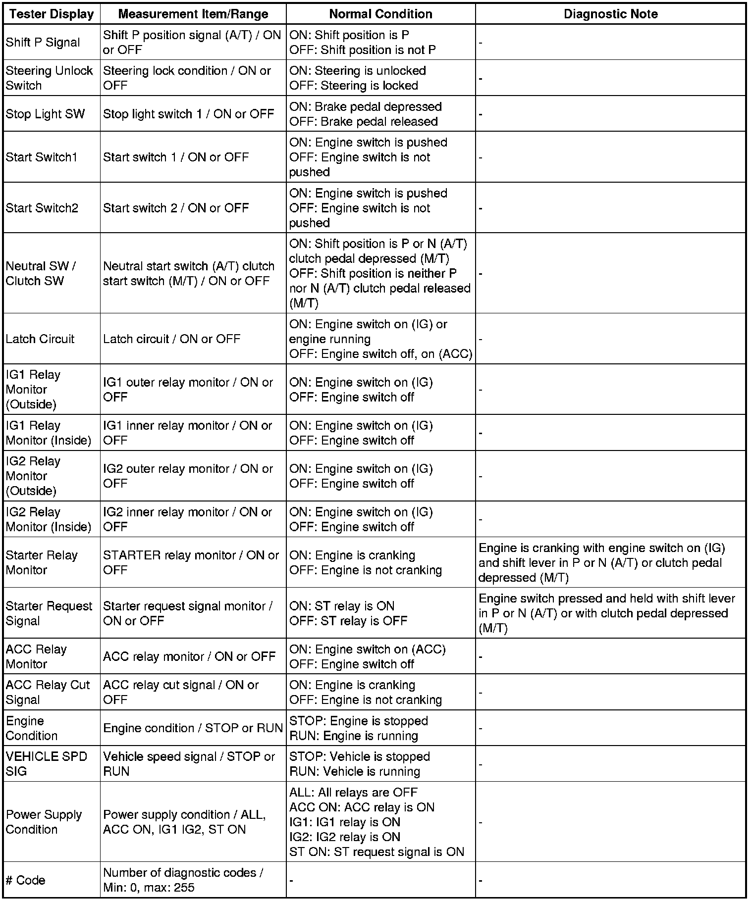 Using Techstream to read the Data List allows the values or states of switches, sensors, actuators and other items to be read without removing any parts. This non-intrusive inspection can be very useful as intermittent conditions or signals may be discovered before parts or wiring is disturbed. Reading the DATA LIST information early in troubleshooting is one way to save diagnostic time.