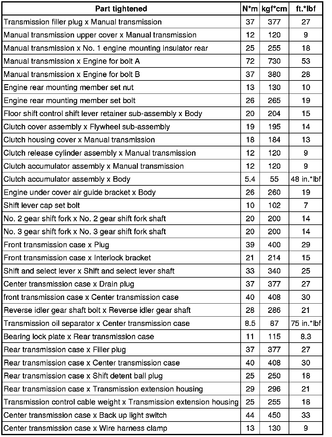 SERVICE SPECIFICATIONS: RA62 MANUAL TRANSMISSION: TORQUE SPECIFICATIONS