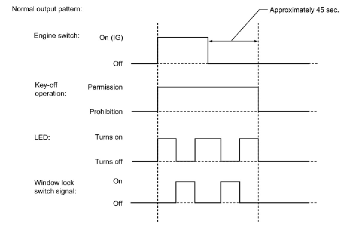 During normal operation (fail-safe is not operating), or during fail-safe mode when there is a pulse sensor malfunction or the window position or learned value is abnormal, the LED illuminates as shown in the illustration.
