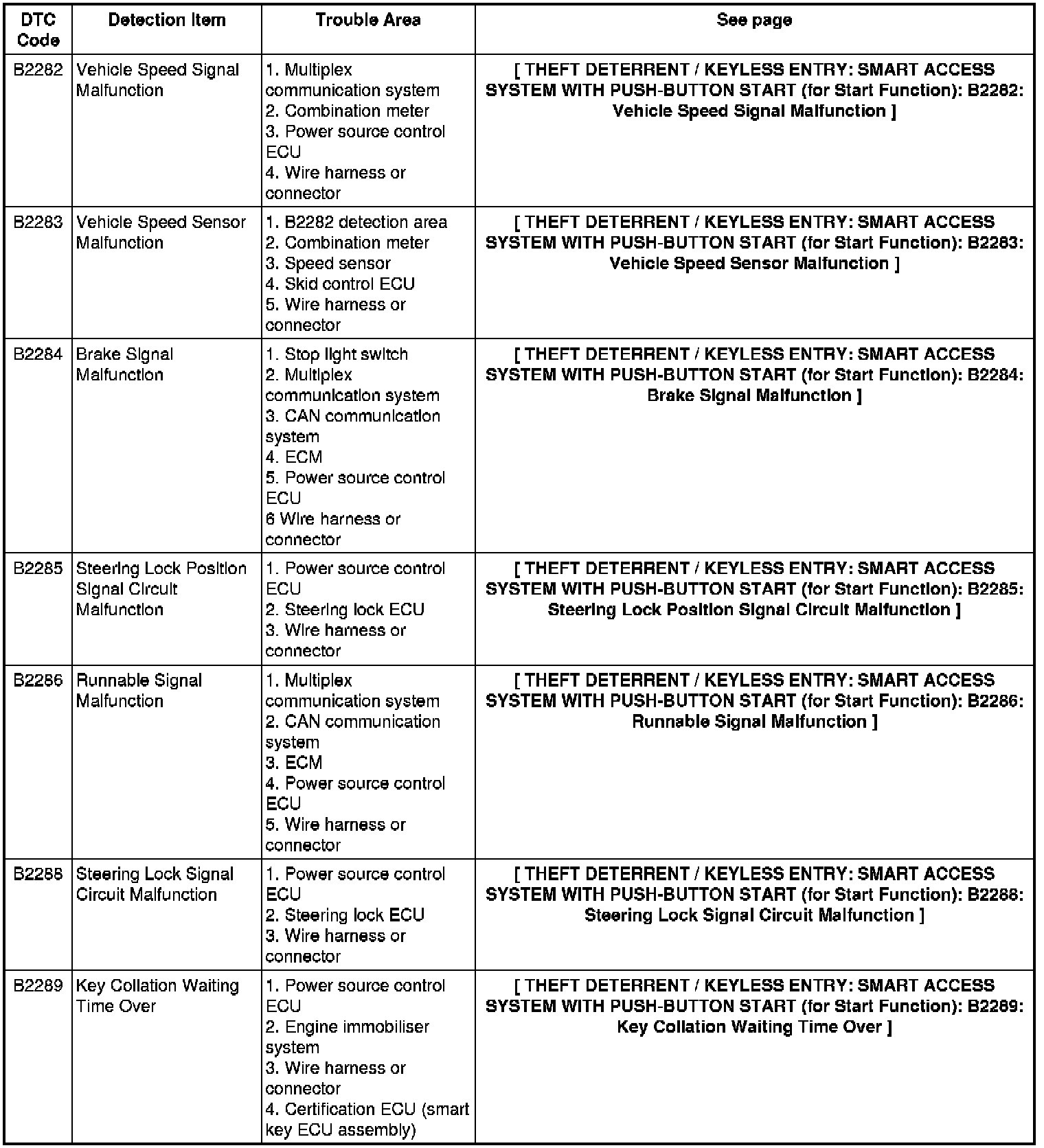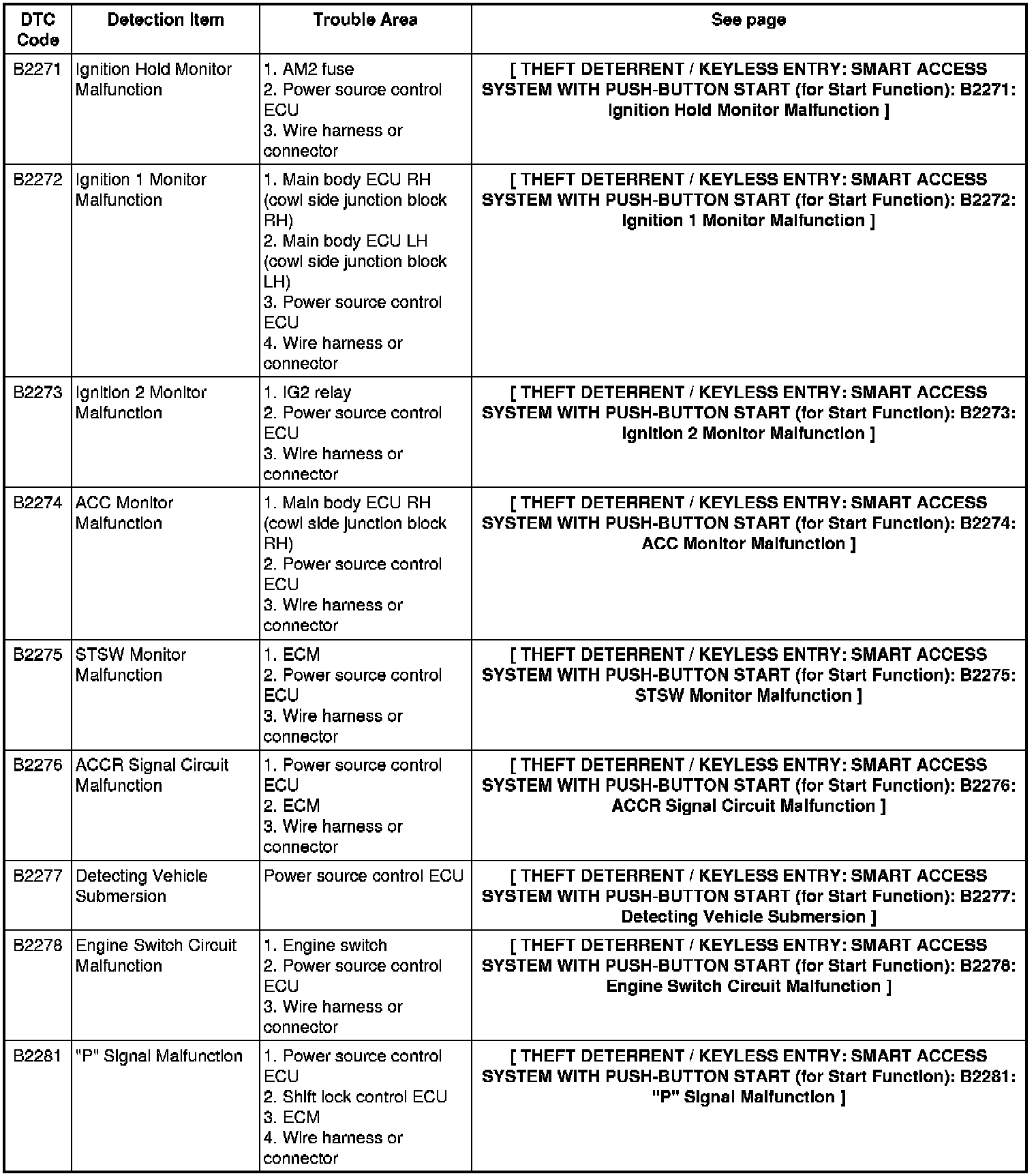 THEFT DETERRENT / KEYLESS ENTRY: SMART ACCESS SYSTEM WITH PUSH-BUTTON START (for Start Function): DIAGNOSTIC TROUBLE CODE CHART