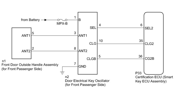 When the entry lock and unlock functions do not operate only for the front passenger door, an error in output request codes from the front passenger door or malfunction in the front door outside handle assembly is suspected. If the entry functions for the other doors operate normally, then the communication circuit between the key and door control receiver is functioning normally. In this case, radio wave interference or a malfunction in the request code sending circuit (from the certification ECU (smart key ECU assembly) to the front door outside handle assembly (for front passenger side)) is suspected.