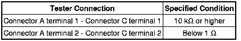 * If the results match the values specified above, an open circuit exists between terminal 1 of connector A and terminal 1 of connector C.