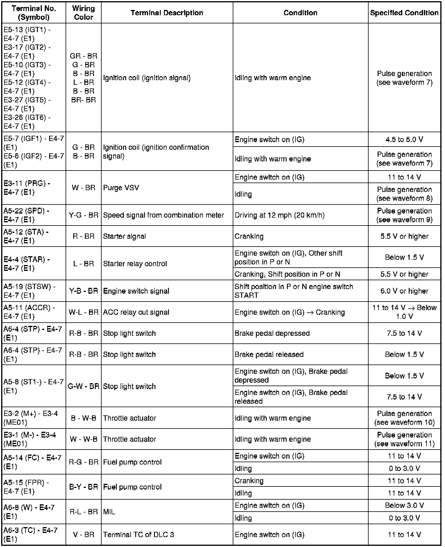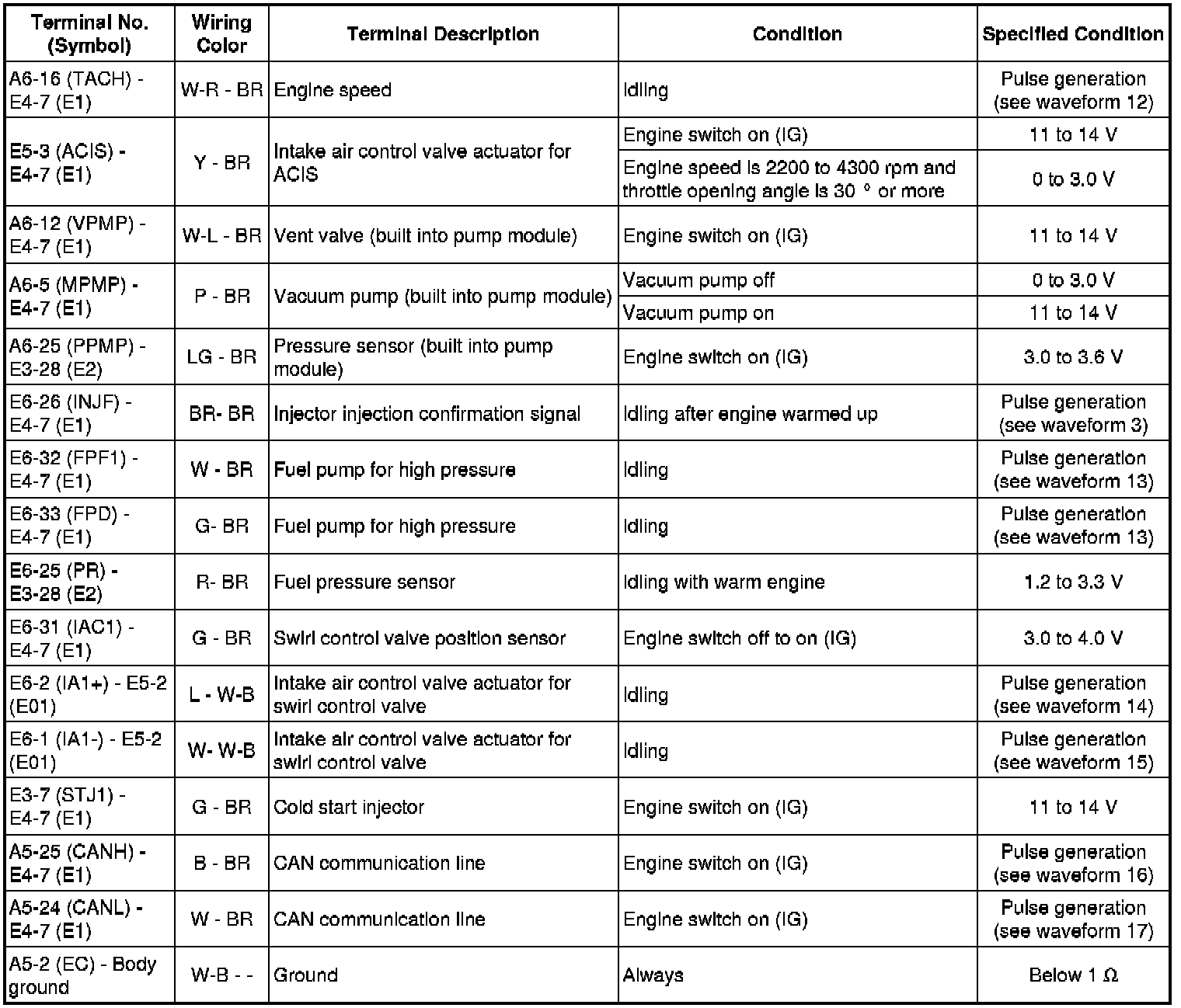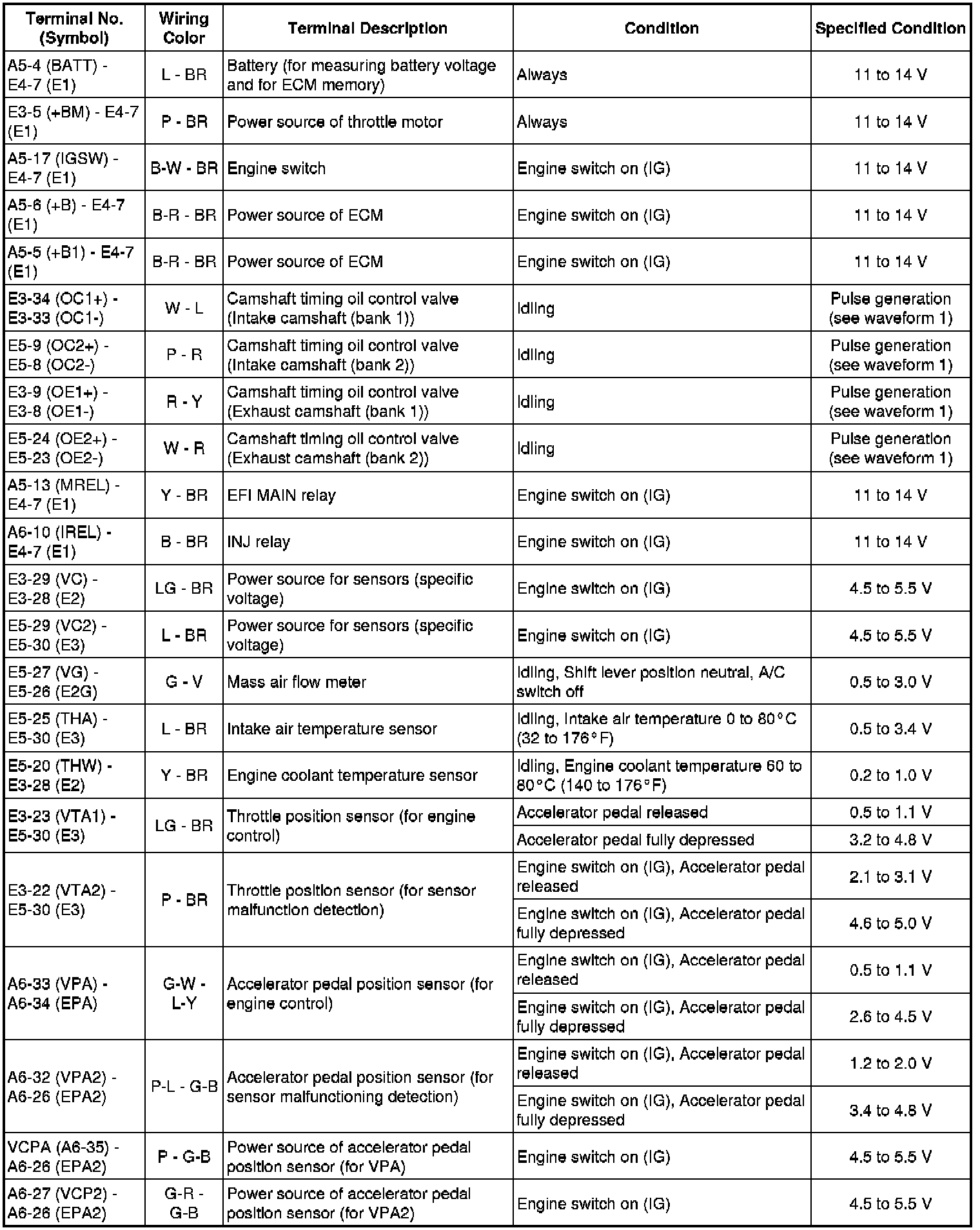 The standard normal voltage between each pair of the ECM terminals is shown in the table below. The appropriate conditions for checking each pair of the terminals are also indicated. The result of checks should be compared with the standard normal voltage for that pair of terminals, displayed in the Specified Condition column. The illustration above can be used as a reference to identify the ECM terminal locations.
