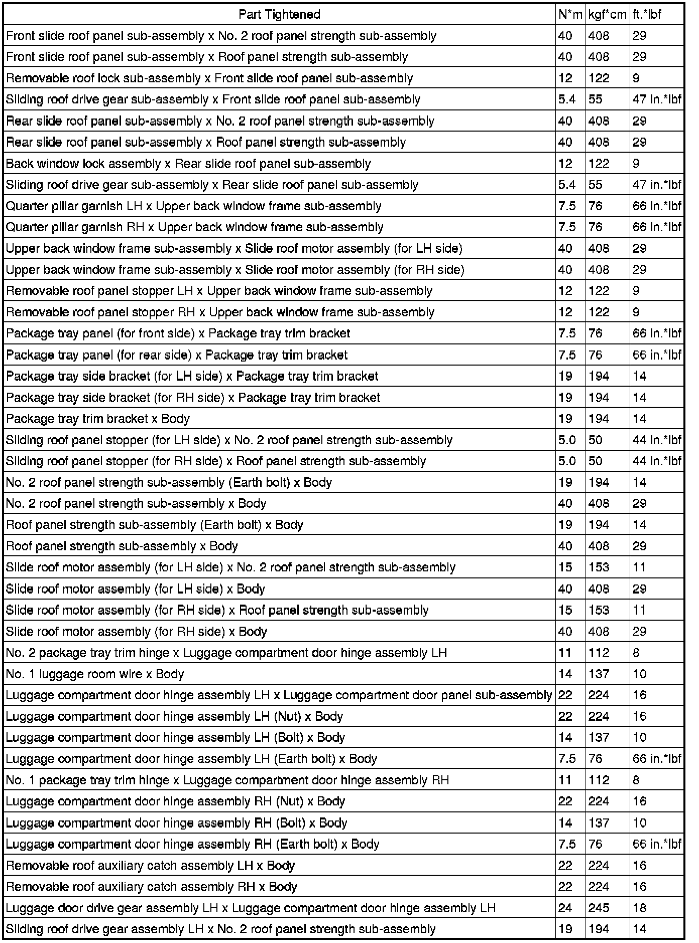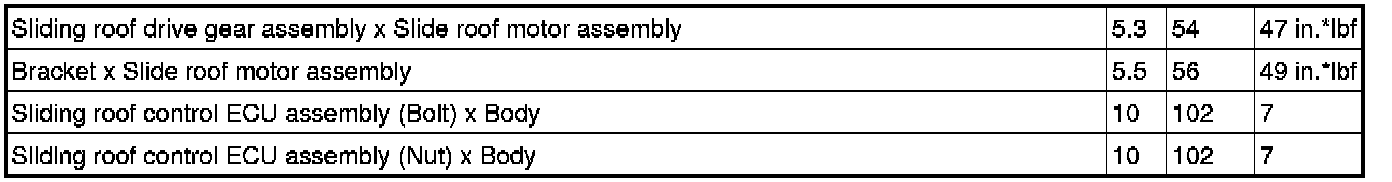 SPECIFICATIONS: SLIDING ROOF / CONVERTIBLE: TORQUE SPECIFICATIONS