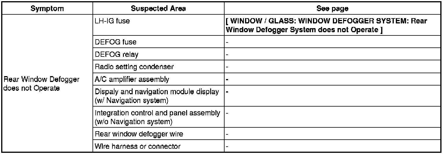 WINDOW / GLASS: WINDOW DEFOGGER SYSTEM: PROBLEM SYMPTOMS TABLE