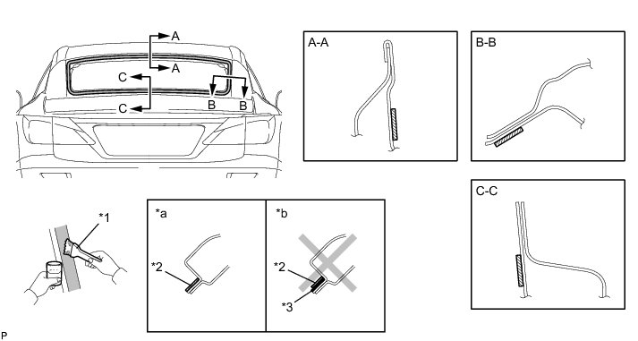(b) Install the new back window glass adhesive dam, applying double-sided tape all the way around the glass except where the dam is installed, as shown in the illustration.