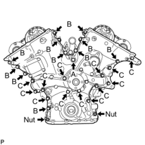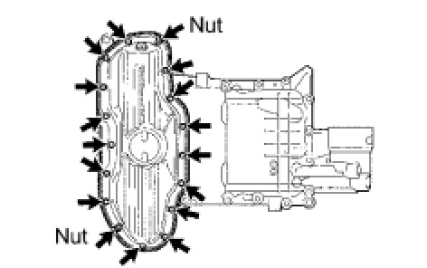 (b) Install the oil pan with the 16 bolts and 2 nuts.