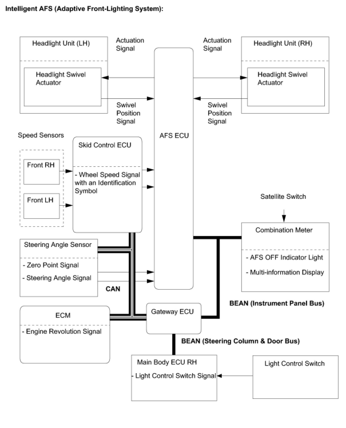 * This system consists of the two headlight units for LO/HI beam (discharge illumination), the AFS ECU, two headlight swivel actuators, steering angle sensor and front speed sensors. The AFS ECU controls this system.