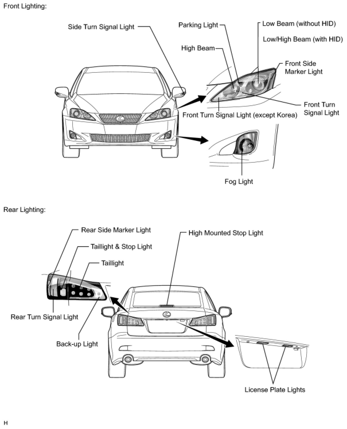 The lights that are controlled are shown in the Front Lighting and Rear Lighting illustrations.