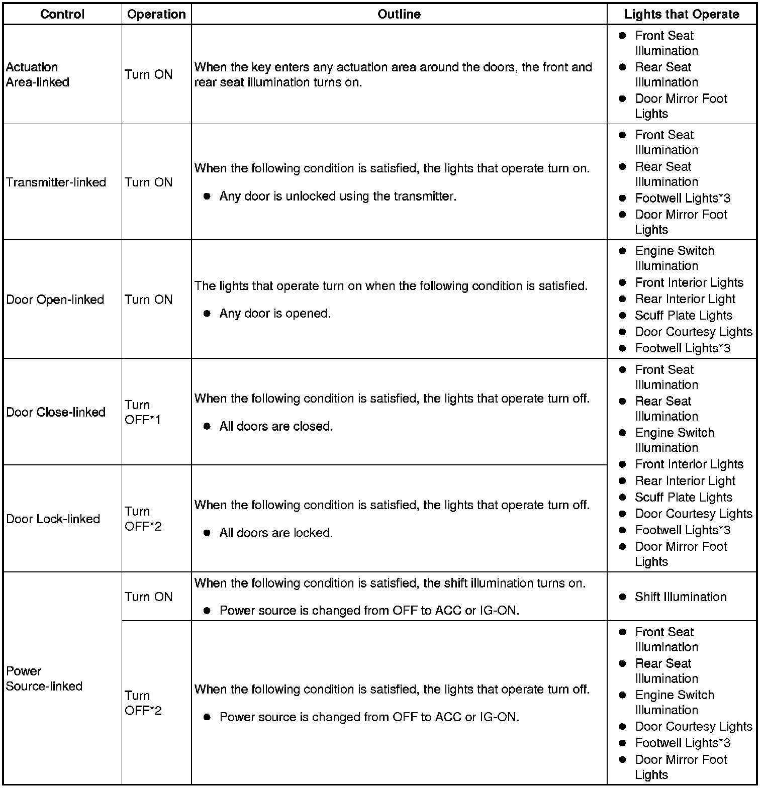 *3: The footwell lights go off when the light control rheostat is adjusted to the minimum level.