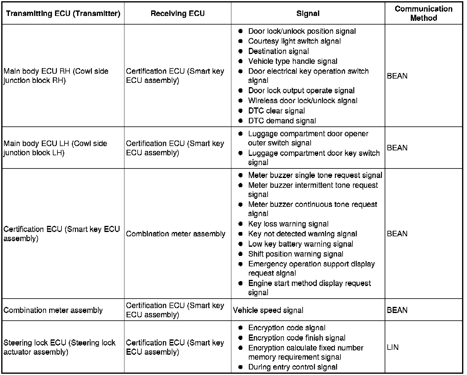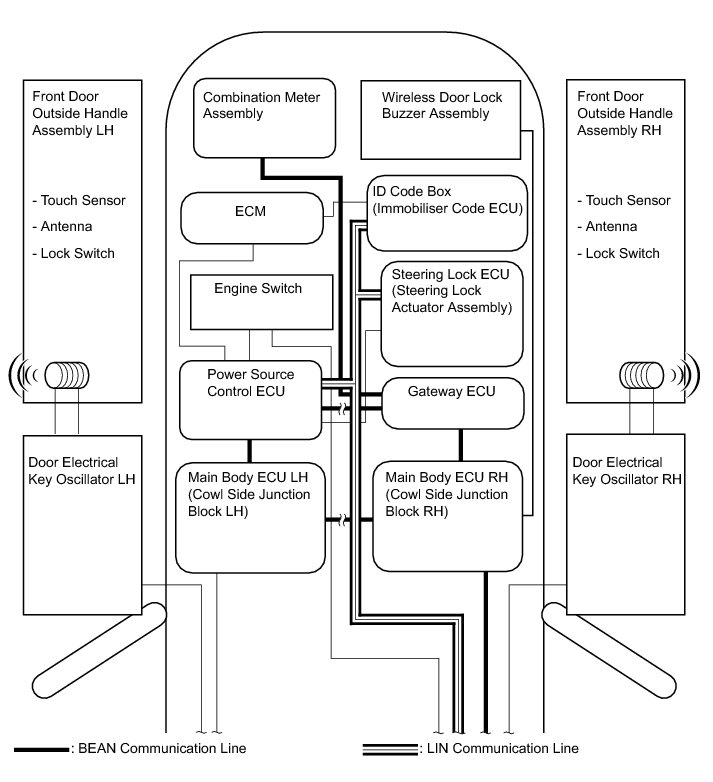 * This system is controlled by the certification ECU (smart key ECU assembly). When the certification ECU (smart key ECU assembly) detects the presence of the smart access system with push-button start in one of the detection areas, it identifies and checks the ID code, and outputs operation signals to the related ECU in accordance with their functions.