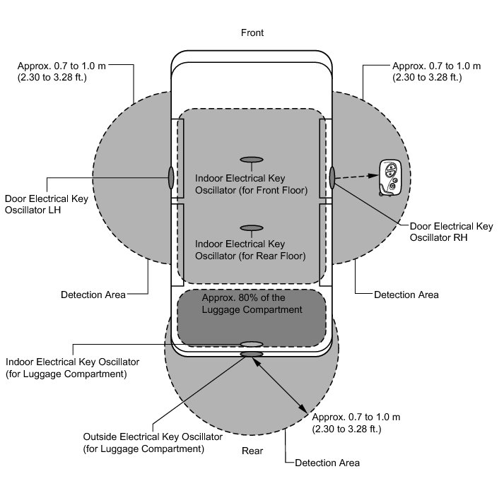 Each oscillator transmits the request signal received from the certification ECU (smart key ECU assembly), and forms a key detection area to detect the presence of a key. The detection area formed by each door electrical key oscillator and outside electrical key oscillator (for luggage compartment) is approximately 0.7 to 1.0 m (2.30 to 3.28 ft.) from the outside handle of each door or the center of the rear bumper.