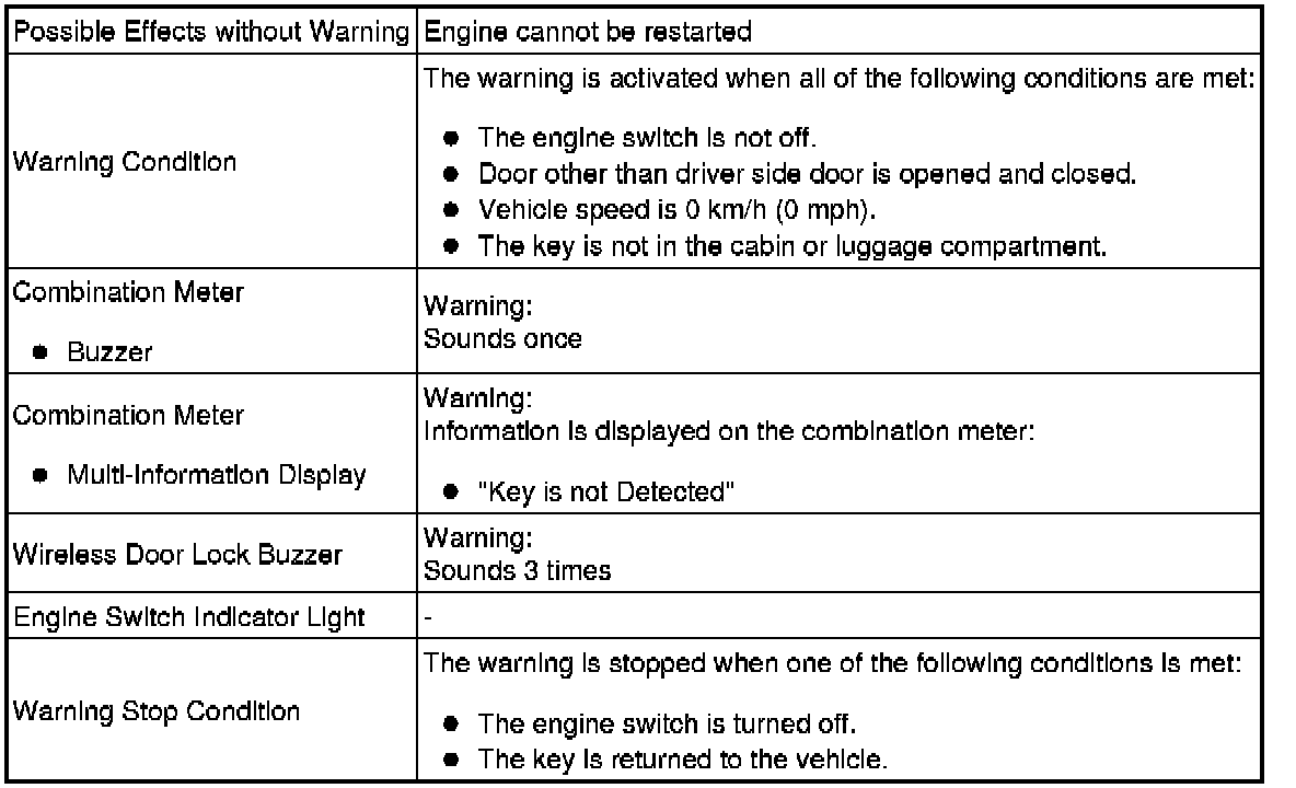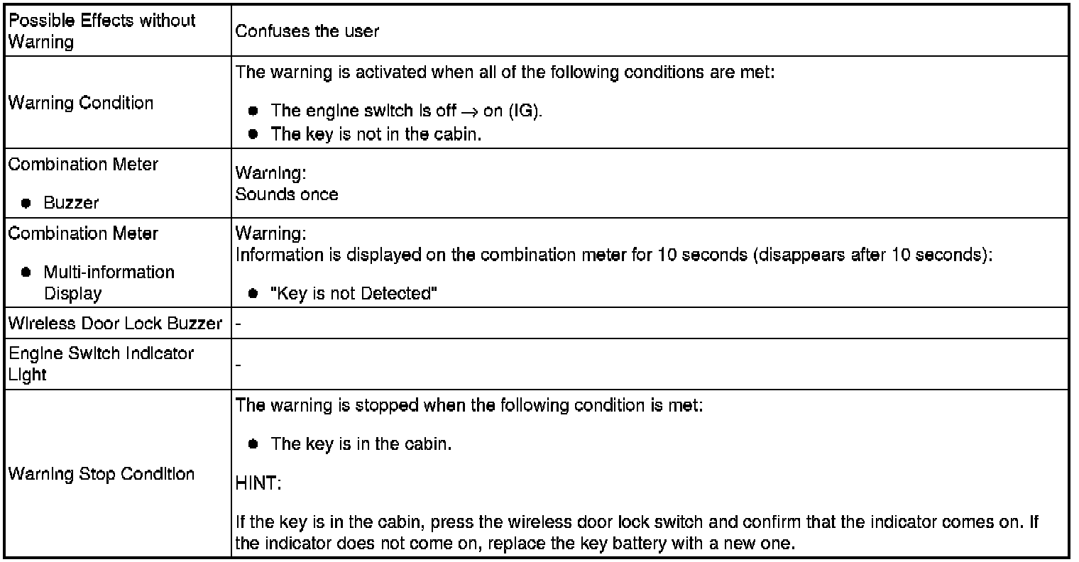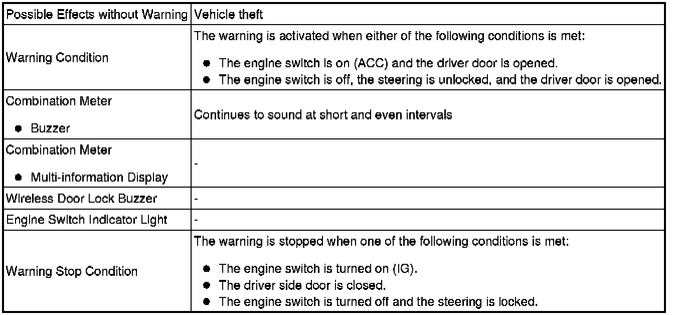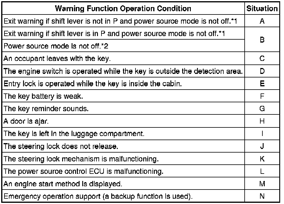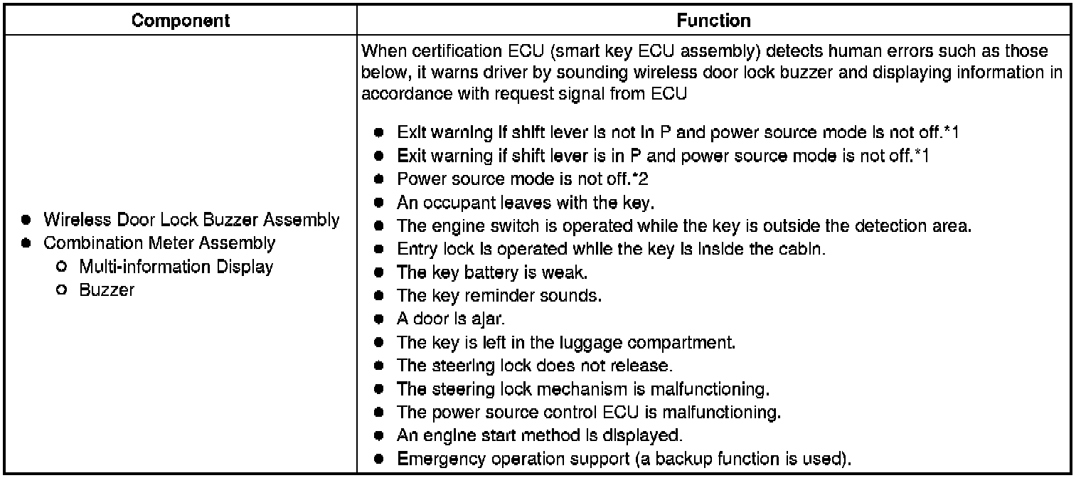 When any of the situations below occur, the smart access system with push-button start causes the certification ECU (smart key ECU assembly) to sound the buzzer in the combination meter and the wireless door lock buzzer, and a message to appear on the multi-information display in order to alert the driver.