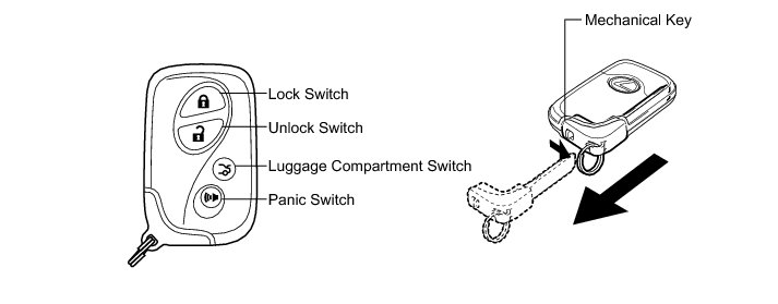 Push the lock switch, unlock switch, luggage compartment switch and panic switch on the key to operate each function. For details, Operation Check.