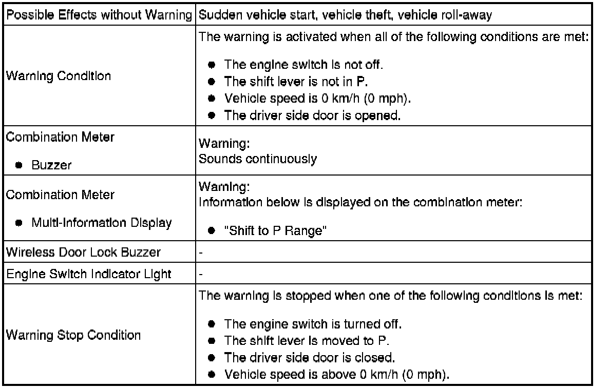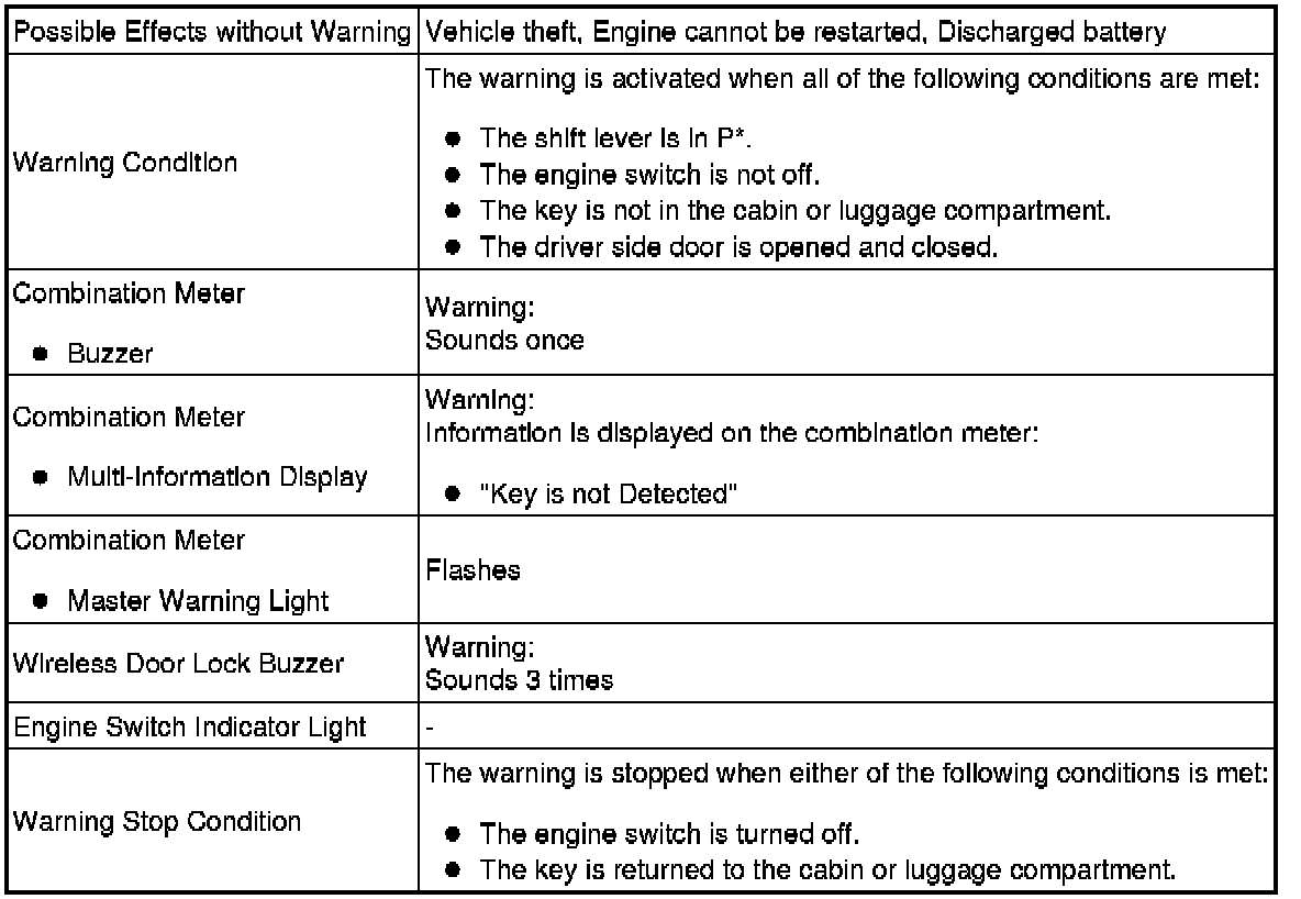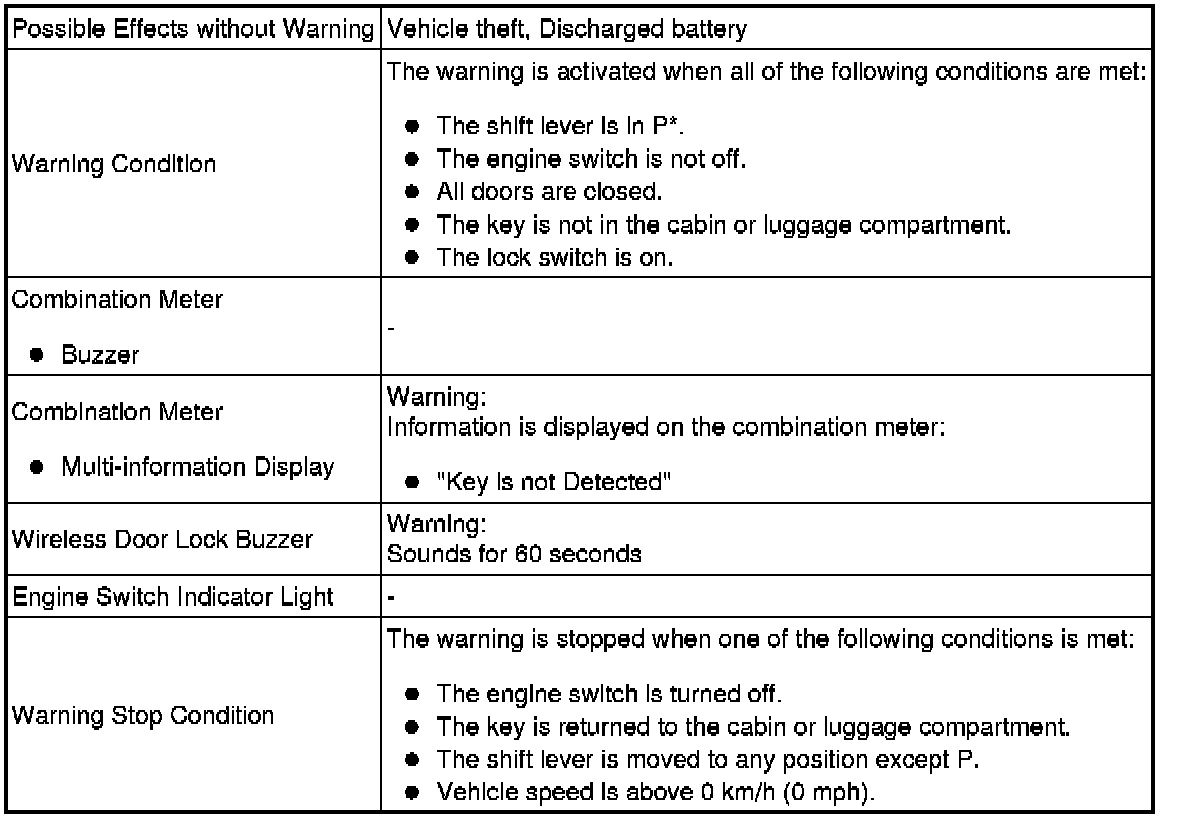 * Pattern 1: When the engine is left running and the shift lever is in P, the driver closes the driver door and attempts to leave the vehicle while holding the key.