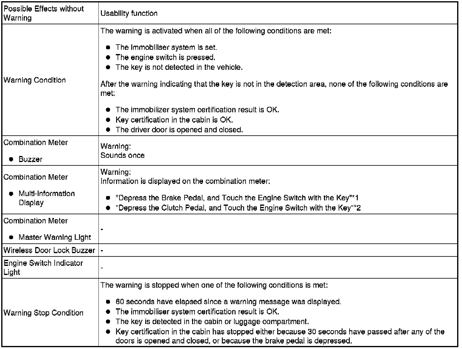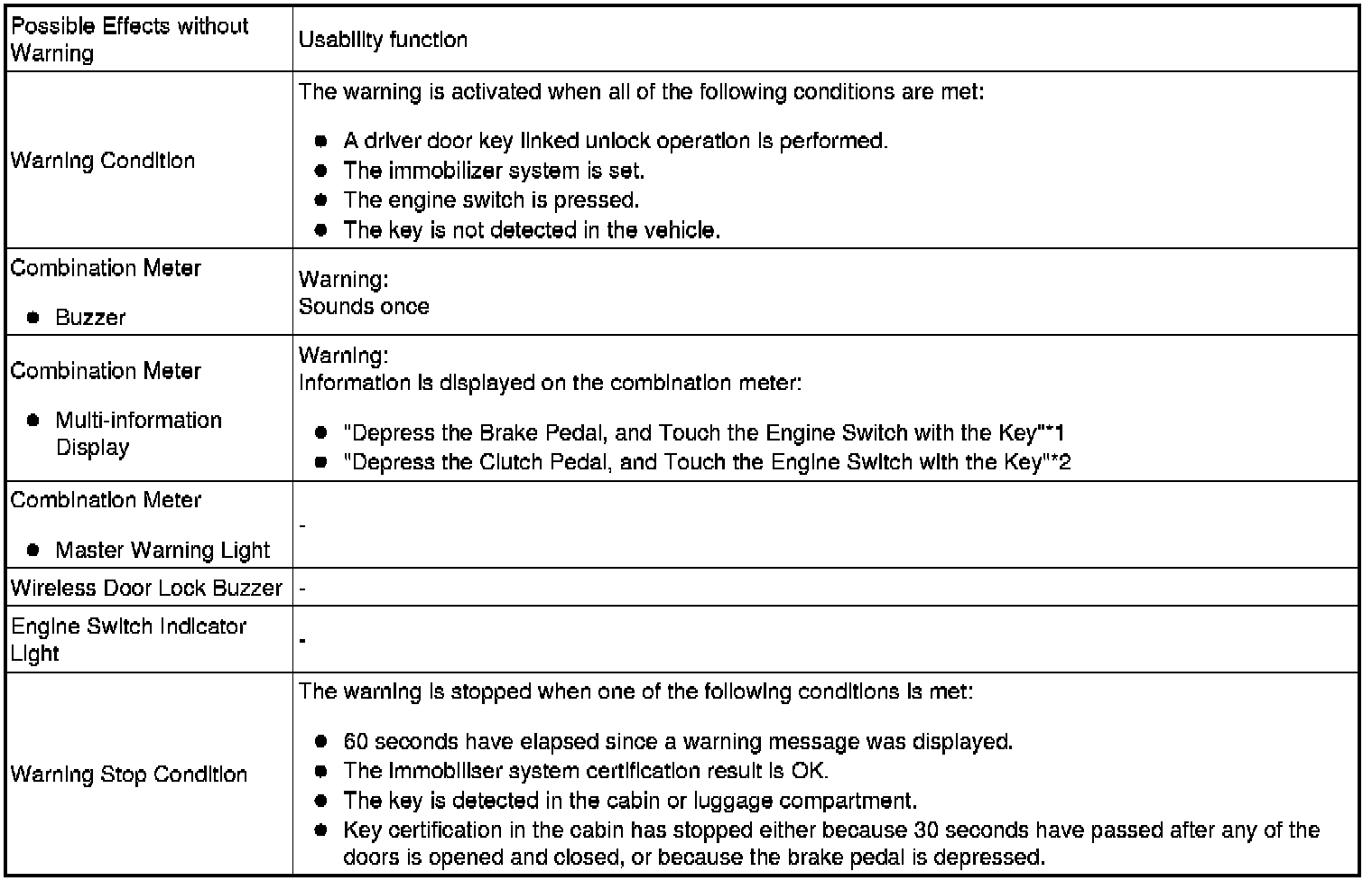 * Pattern 2: Under the conditions of pattern 1, the driver closes the door and attempts to leave the vehicle while holding the key.